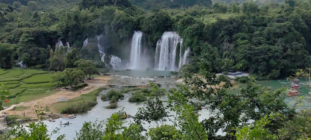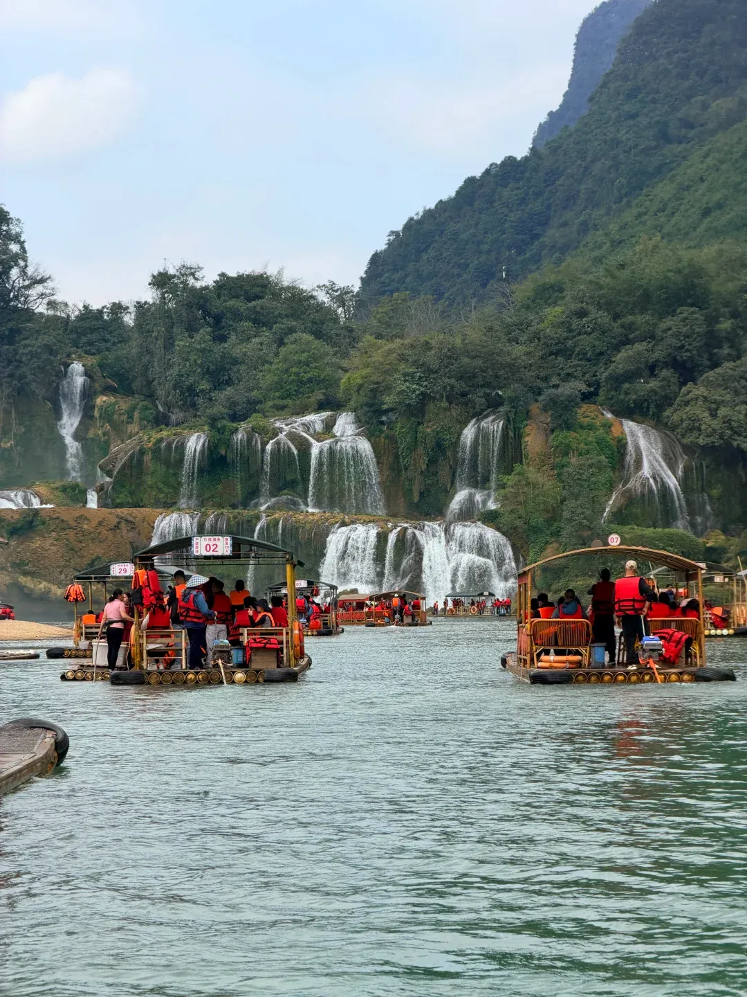每年5-10月是丰水期,水量最大、最为壮观,尤其是11:30-14:30越南放水时段,瀑布水流奔腾而下,水雾漫天,仙气十足。核心体验一定要坐竹筏,零距离感受瀑布的冲击力,竹筏驶至瀑布脚下,水雾打在脸上,清凉又震撼,河对岸就是越南的村庄和商铺,不用出境就能感受异国风情。
