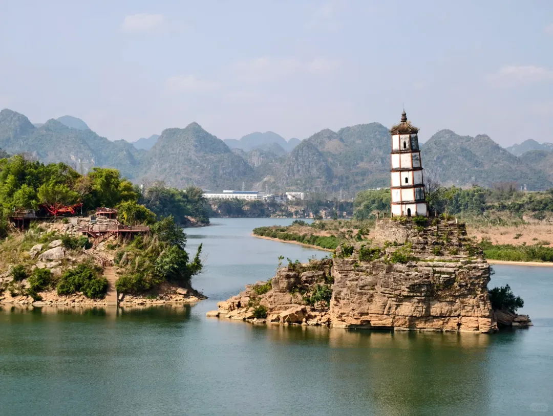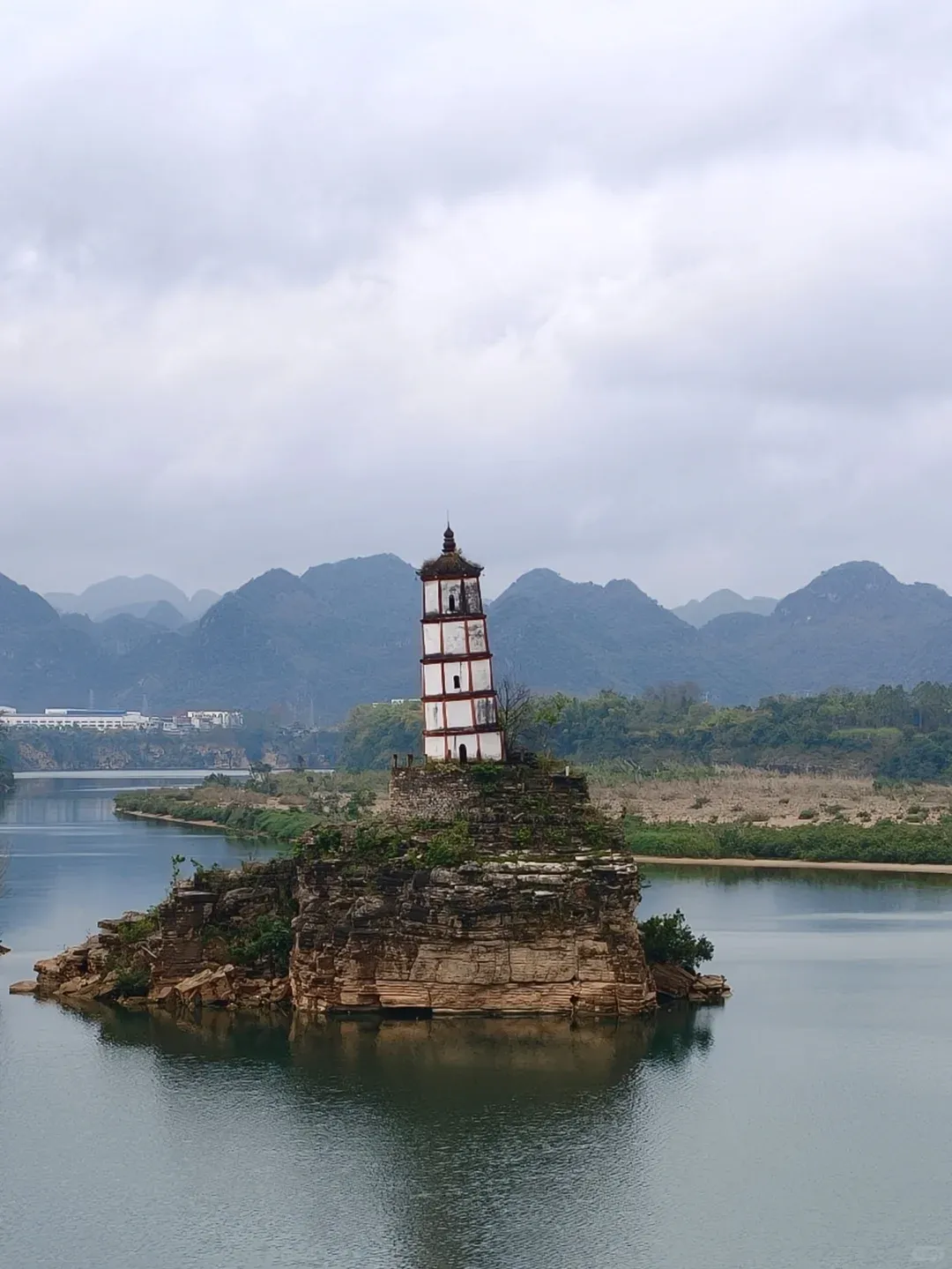 🌟 推荐理由:这是一座充满古人智慧的建筑奇观,建于明朝,矗立于左江江心鳌头山上,为抗洪防风而有意建斜,是世界八大斜塔之一。最佳观景点在崇左市区江对岸的旅游码头附近,远观斜塔与山水倒影,画面十分出片。若时间充裕,可乘船登岛,近距离观察这座古老斜塔的建筑细节,感受古人的建筑智慧,景区较小,适合作为串联行程中的补充景点。