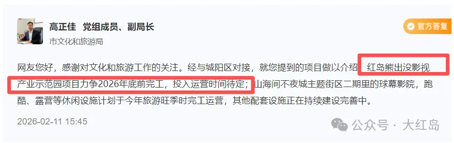 2月11日,据青岛市文化旅游局透露,经与城阳区对接,红岛熊出没影视产业示范园项目力争2026年底前完工,投入运营时间待定。