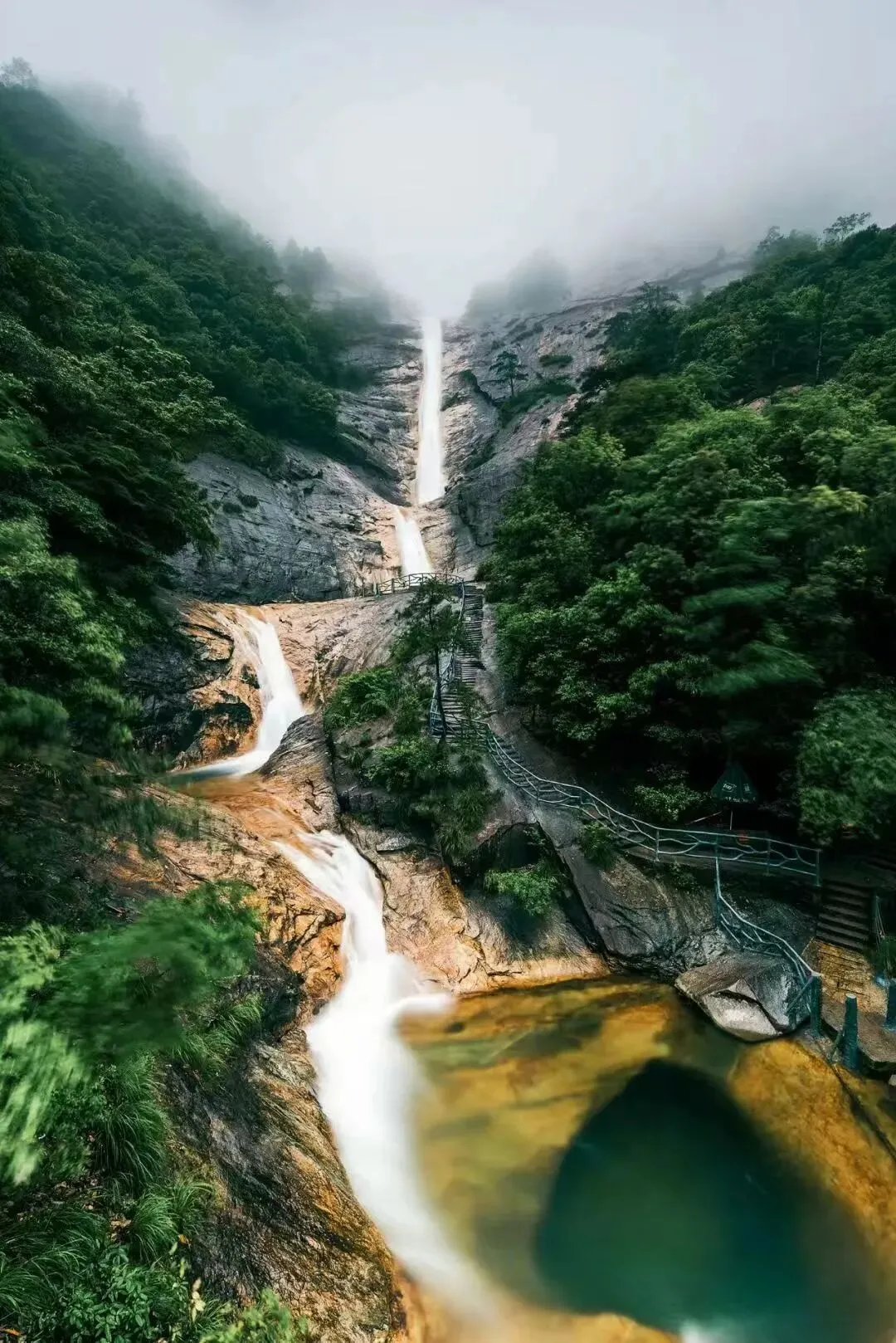 在黄山的香庐峰和罗汉峰之间的千仞悬崖上,瀑布分九叠倾泻而下,一叠一潭,九叠九潭,气势雄壮,曲折多姿。全长600米,落差360米。