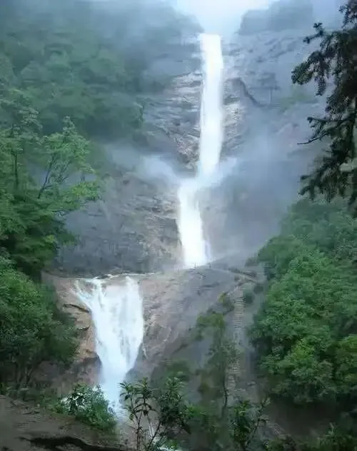 远远望去,两股清流自高崖倾泻而下,形如“人”字,仿佛天地间挥毫写就的一笔浓墨。水声轰鸣,不似喧嚣,反倒像一首古老的歌谣,在山谷中回荡。