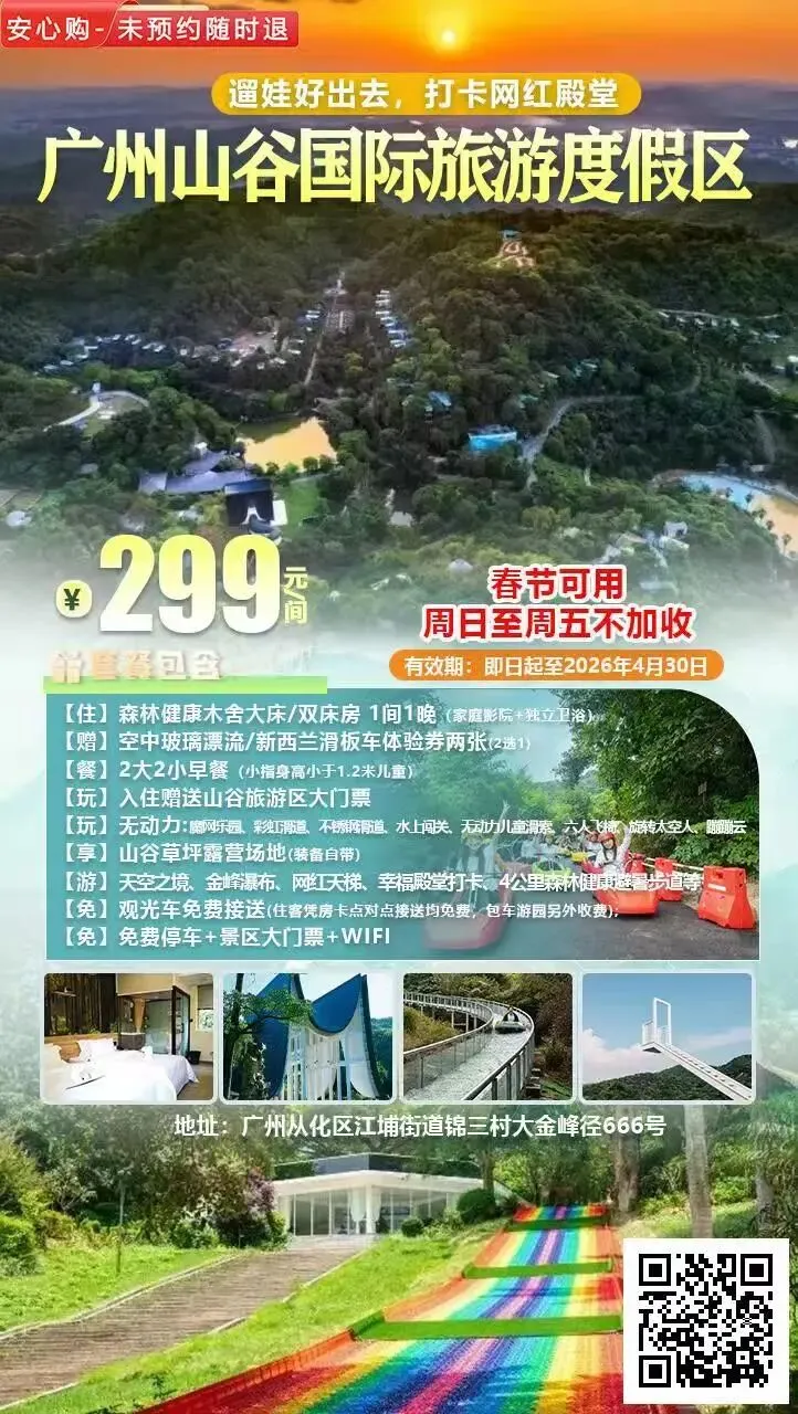 ¥299入住【广州·山谷国际旅游度假区】森林健康木舍大床/双床房,玩空中玻璃漂流/新西兰滑板车体验券两张(2选1)+大2小早餐