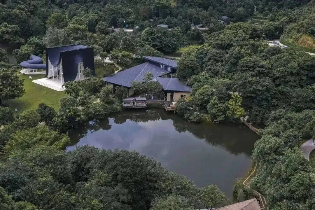 位于广州从化桃花小镇内。背靠大金峰,四面环山,周围被树木环绕,与山谷地形巧妙的融合。