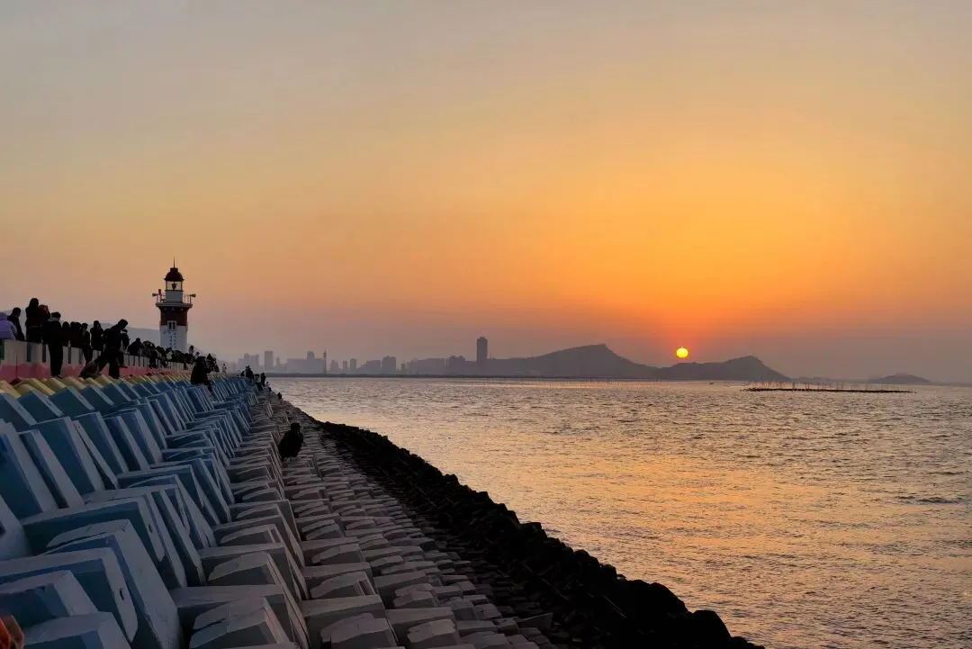 抵达堤头,灯塔附近早已站满观日落的人,我们只能稍远些爬上堤坝高墙,恰好赶上日落。夕阳沉入海面,霞光漫天,海水被染成金红,海风轻拂,光影流转,美得醉人,所有疲惫都被这壮阔景色抚平。