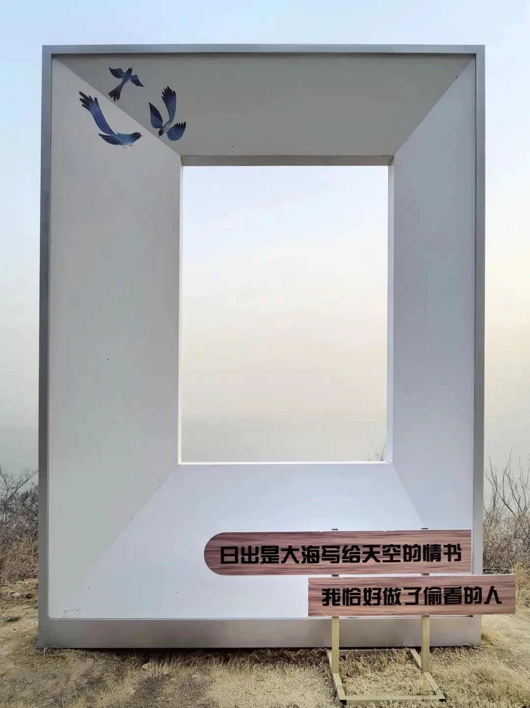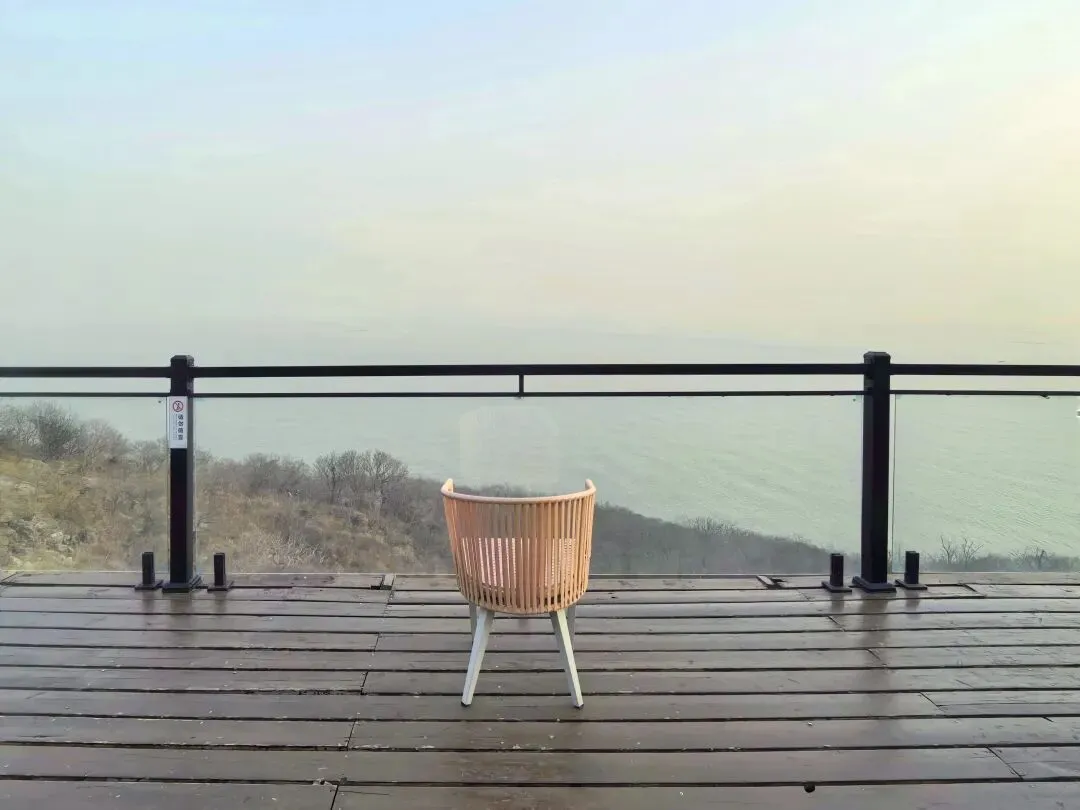 从邓小平公园沿海岛东路返回取车,晨雾轻笼海面,晕开朦胧的青灰。网红相框装置伫立在坡上,“奔赴山海”的标语衬着辽阔海景,海风拂过,仿佛连飞鸟都在为这份浪漫驻足。红色的可乐打卡点点缀木栈道,一把藤椅静静倚着栏杆,独享这份静谧。远处波光渐醒,轮船在金辉里摇曳,码头的吊机静静伫立,山海相依间,温柔晨景与港口的蓬勃朝气悄然相融。