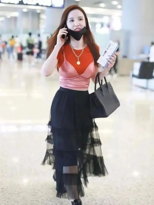 下半身搭配的黑色薄纱半身裙也为整体造型增添了不少亮点。层层叠叠的裙摆显得飘逸灵动,而薄纱的面料则让裙子看起来更加轻盈柔美。这样的穿搭方式既适合炎热的天气,又能展现出女性的优雅和浪漫气息。