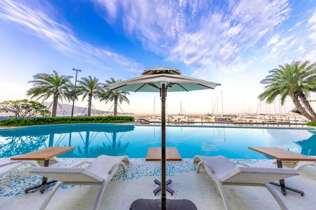 蓝天碧海和泳池相接
