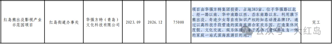 有奖素材+V:xiaobian012 商务合作+V:brandlongvp 3月9日,据@大红岛 社区自媒体检索获悉,城阳区红岛街道在建红岛熊出没影视产业示范园项目(青岛方特二期)进展公布,在经历了延期之后,竣工时间公布,景区预计今年底前完工。