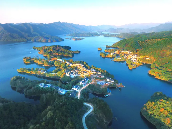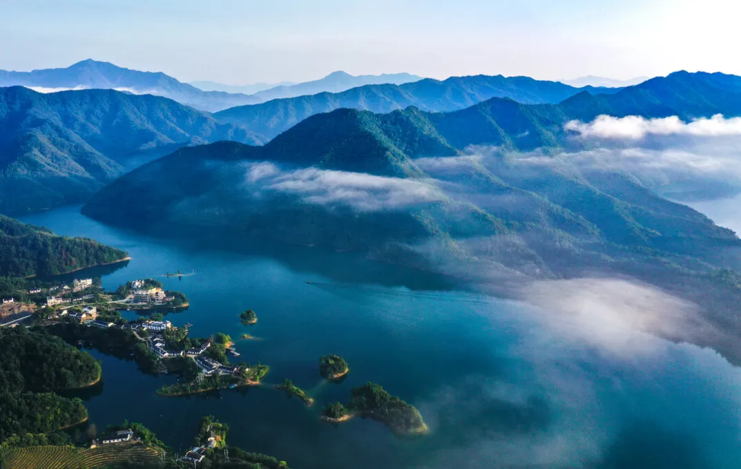 湖中点缀着大小不同、高低不等的岛屿,它们错落有致、似断似连地飘浮在万顷波澜间,仿佛是一座座海上仙山,令人遐想联翩。