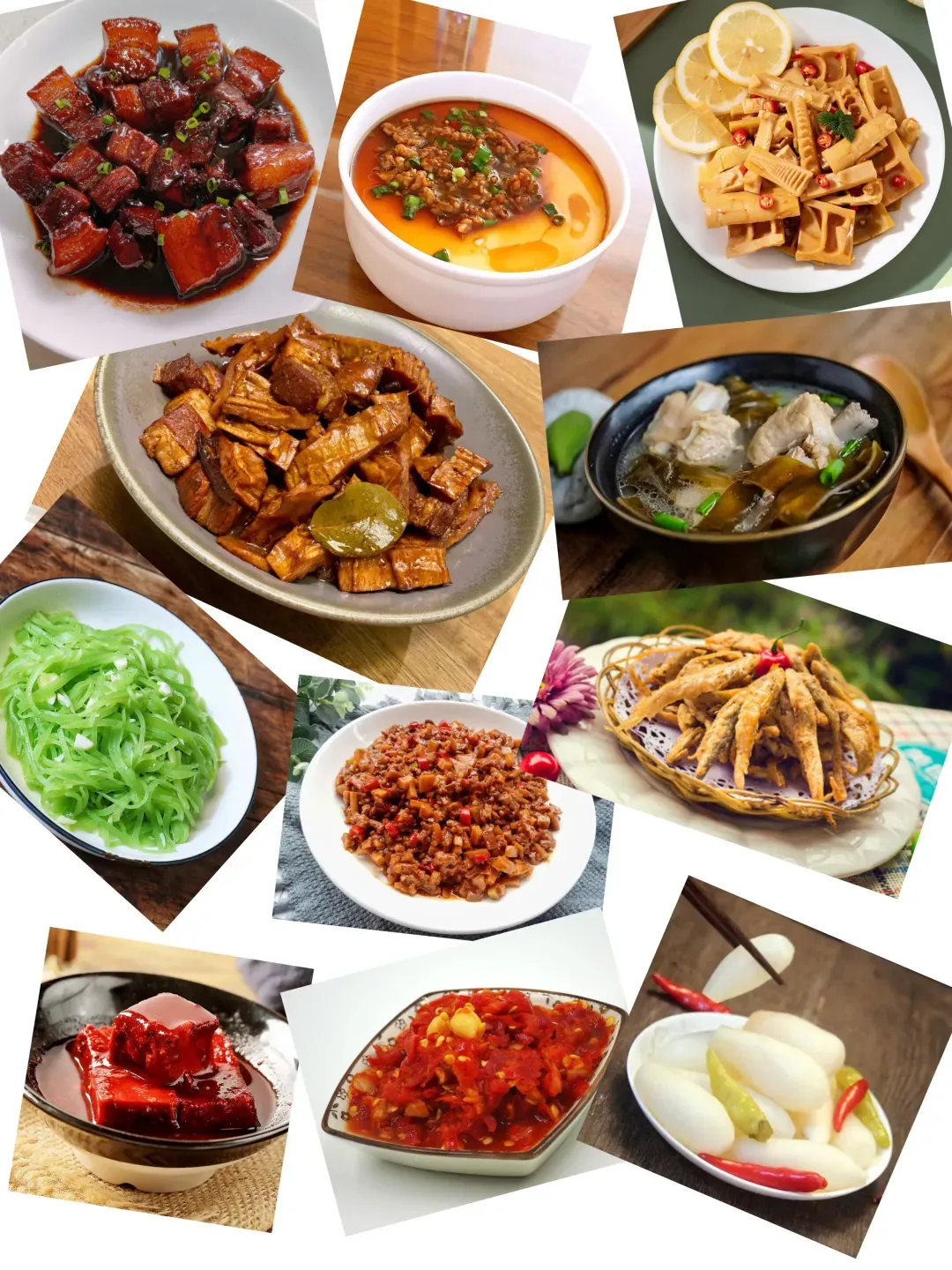 主菜:鲜雷笋烧肉、红烧肉、柠檬汁笋尖、肉沫鸡蛋糕、蒜蓉莴笋丝、椒盐小河鱼、笋丁肉沫杂酱、刀板香梅干菜、排骨海带汤