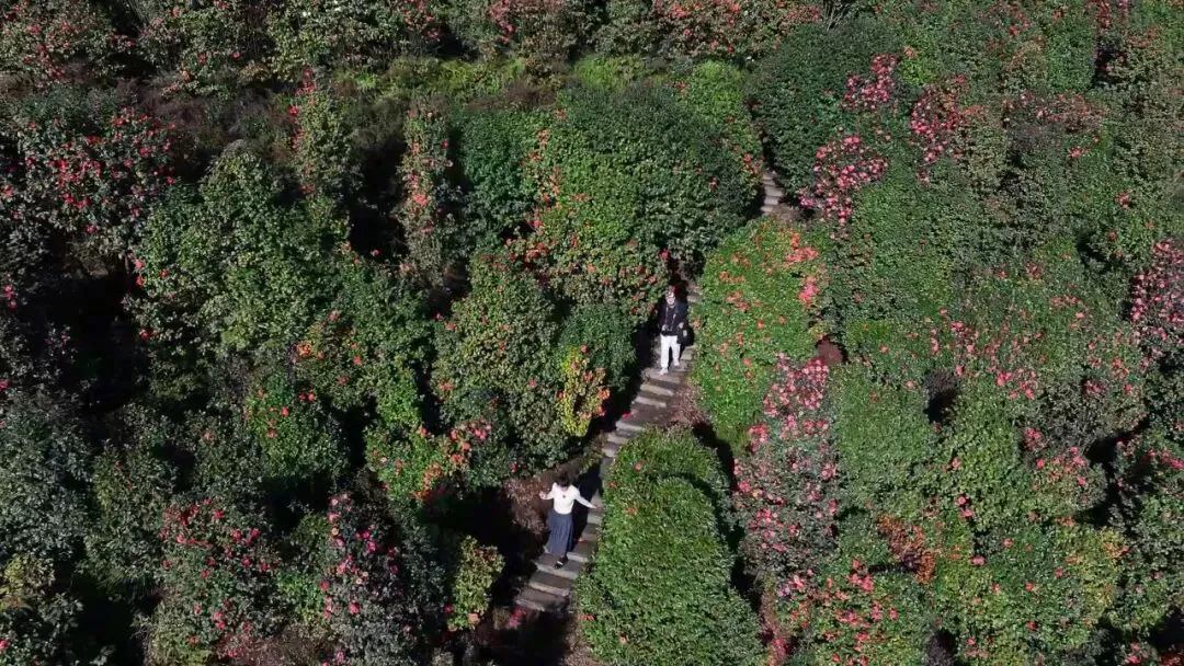 微风轻拂,暗香浮动,花枝轻摇、花瓣翩舞,一派灵动诗意。这般盛景吸引众多游客慕名而来,漫步花间,人们无不被漫山遍野、连绵成片的山茶花海所震撼,连连赞叹春日美景。