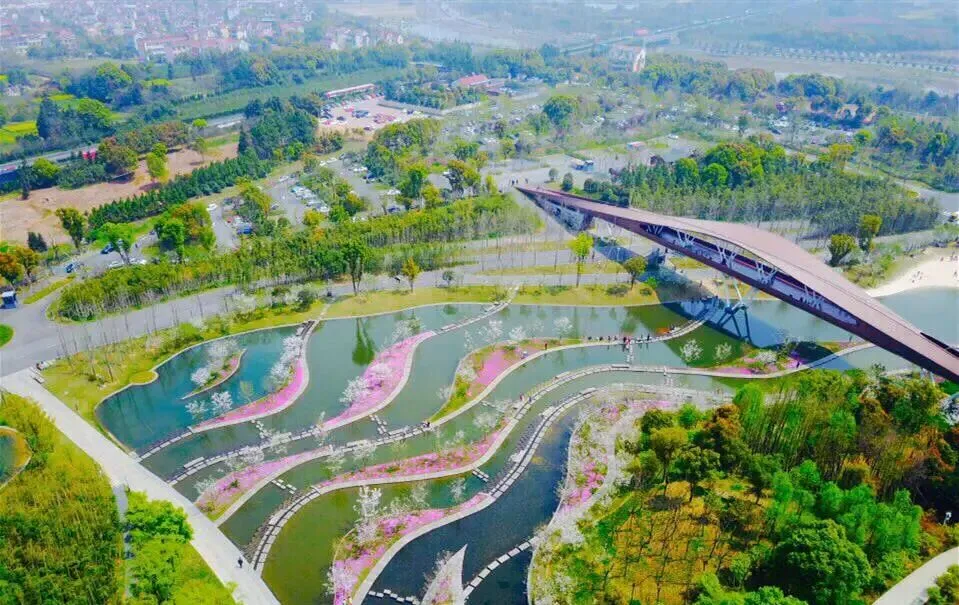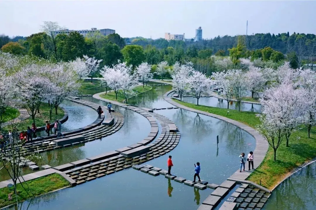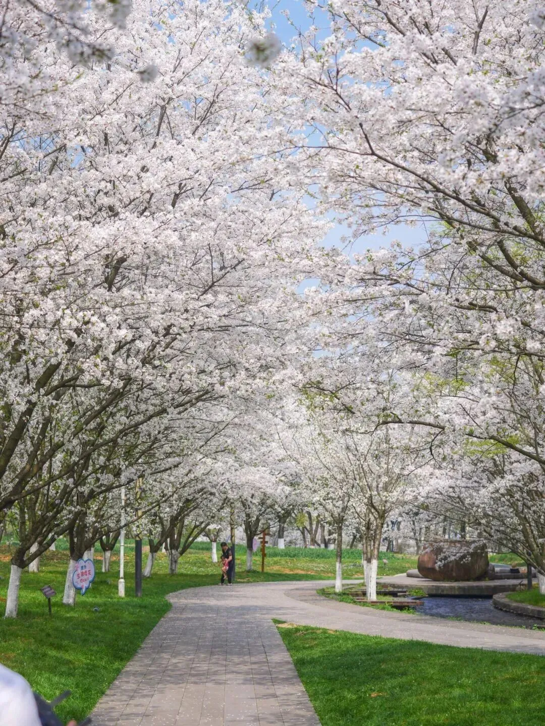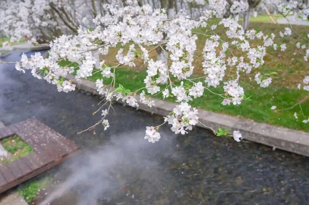 花溪叠水区域似铺开一片浪漫的樱花长廊