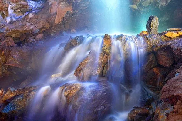 冰壶洞内景色主要为悬挂瀑布,其从暗河飞泻而出,落差达20米,声若巨雷轰鸣,其势壮观无比,为国内外洞景所罕见。
