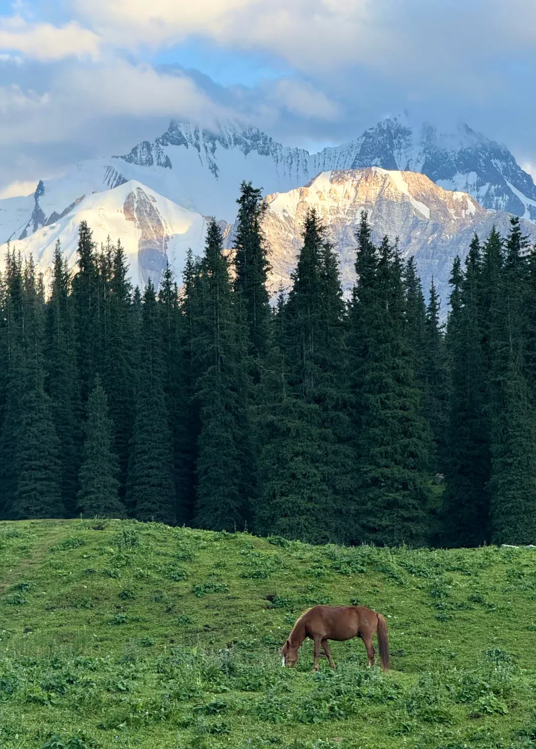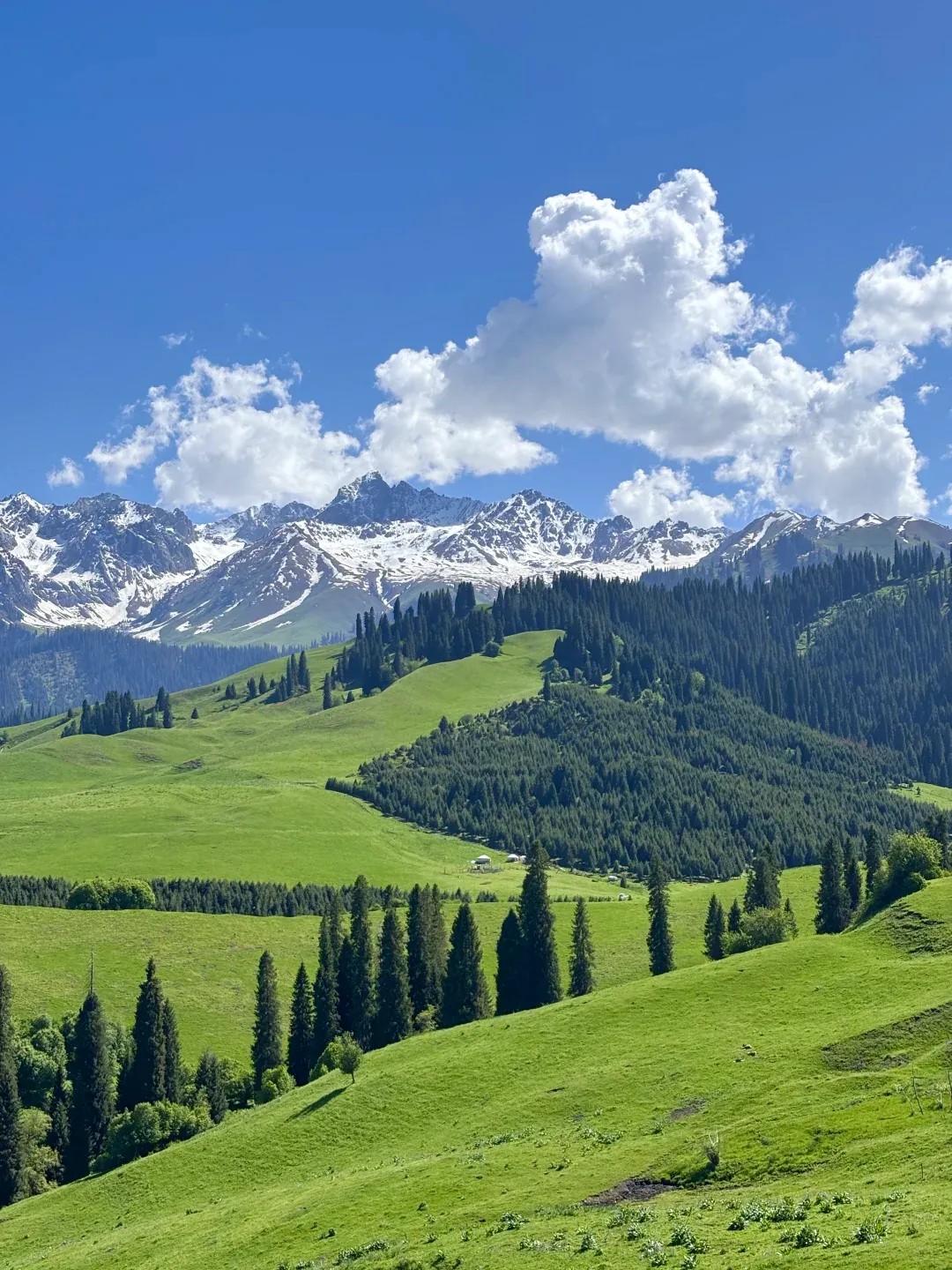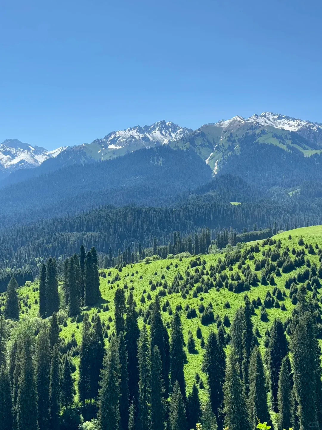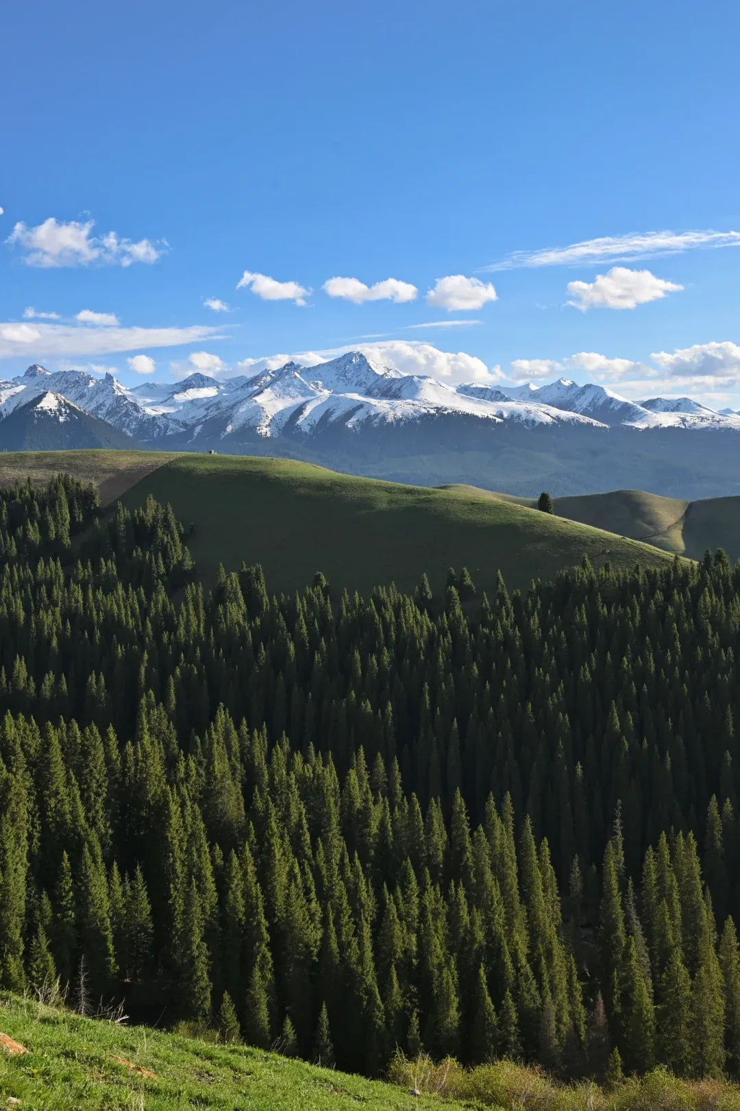 怡西是伊犁最先绿的草原,一般5月份就绿了。 在恰西森林最出片的位置 ,莫过于恰西画卷左边的小山坡 ,那个地方拍旱地拔葱和照片都很出片,穿行于原始云杉森林与高山草甸之间,沿途打卡恰西画卷(雪山、林海、草甸同框的标志性机位)、恰西石门(峡谷溪流与怪石嶙峋的自然奇观)