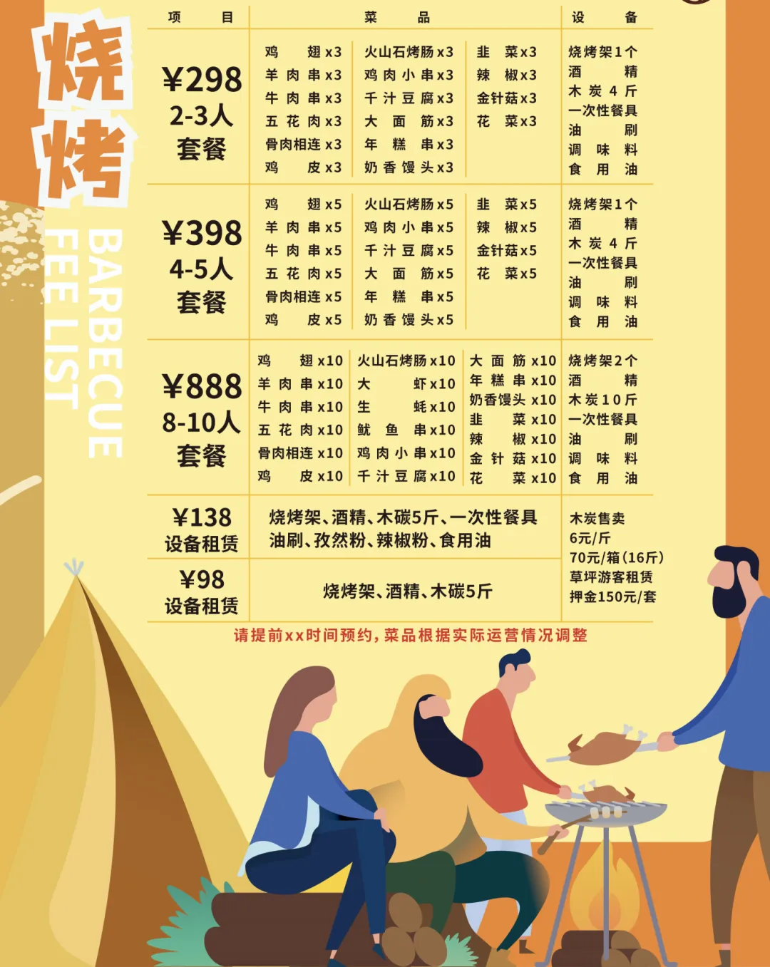 (户外露营套餐100/套,含天幕一桌四椅及场地费)