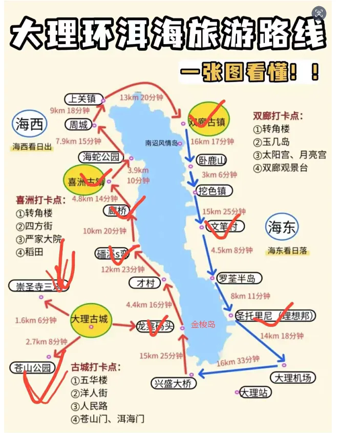 - D2:昆明出发前往大理,环洱海自驾,打卡喜洲古镇、双廊,住洱海