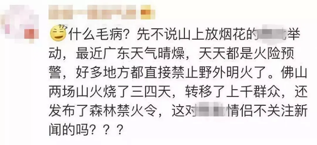 #情侣放烟花拍照引发山火# 这个话题引发网友热议, 并登上了热搜! 也难怪网友们这么愤怒, 就在12月5日, 广东佛山刚刚发生森林火灾, 因为某勘察公司开展钻探工程引发山火, 大片山林沦为火场。 159辆消防车834名消防指战员 冒着生命危险奔赴前线扑救! “差点变成烤红薯……”