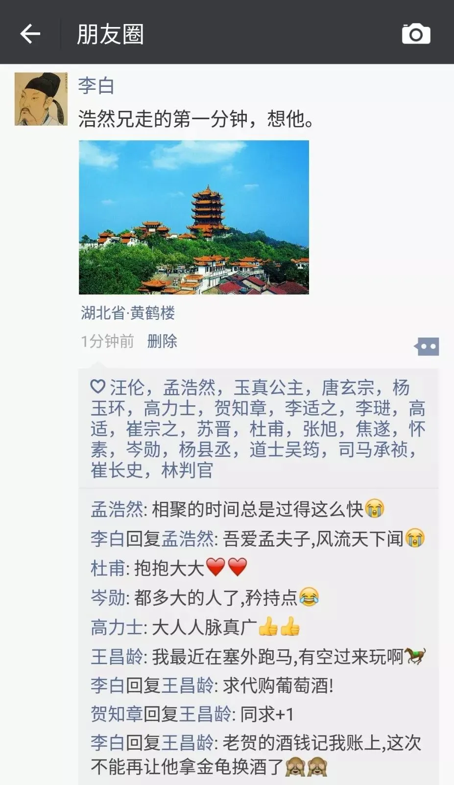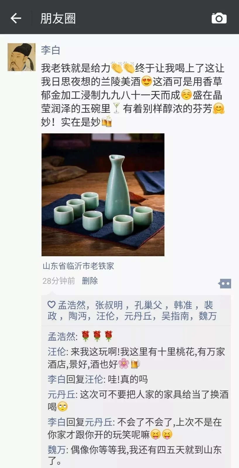 ▲ 「兰陵美酒郁金香,玉碗盛来琥珀光」出自李白《客中行》。这首诗作于李白开元(唐玄宗年号,713—741)年间漫游东鲁之时,应为入长安前的作品。所以大家所熟知的杜甫、贺知章等大大们还没有成功加上好友,就没有点赞评论啦。