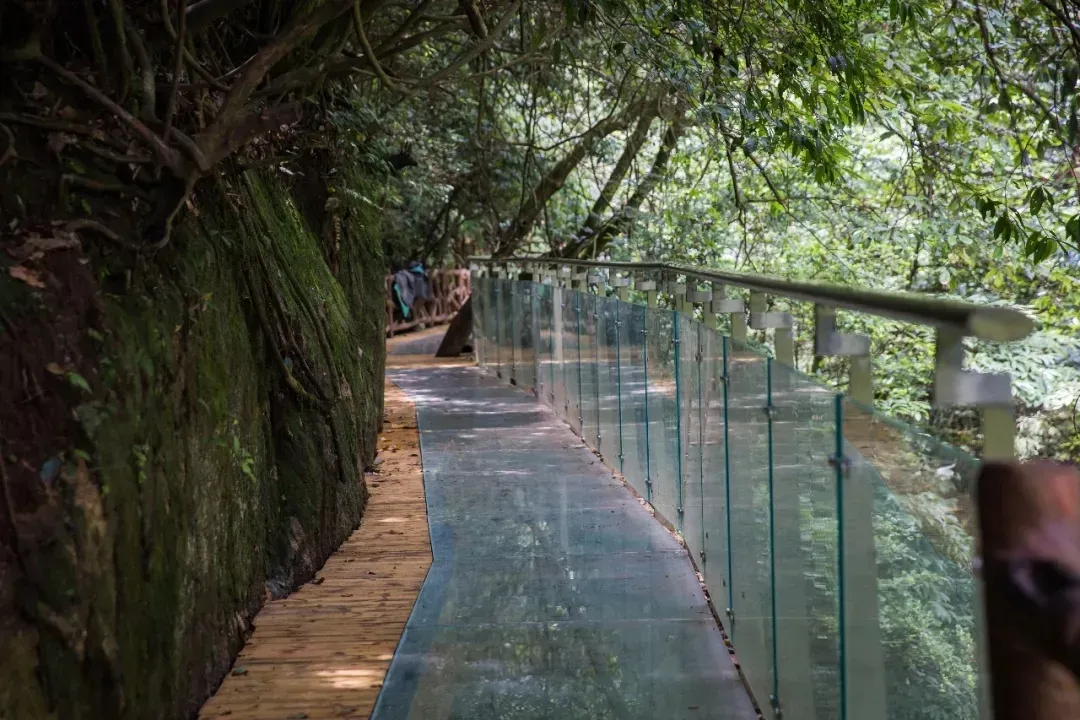 谷内还有索桥,玻璃悬空栈道在峡谷中也能和恋人体验悬空、晃荡的有惊无险。