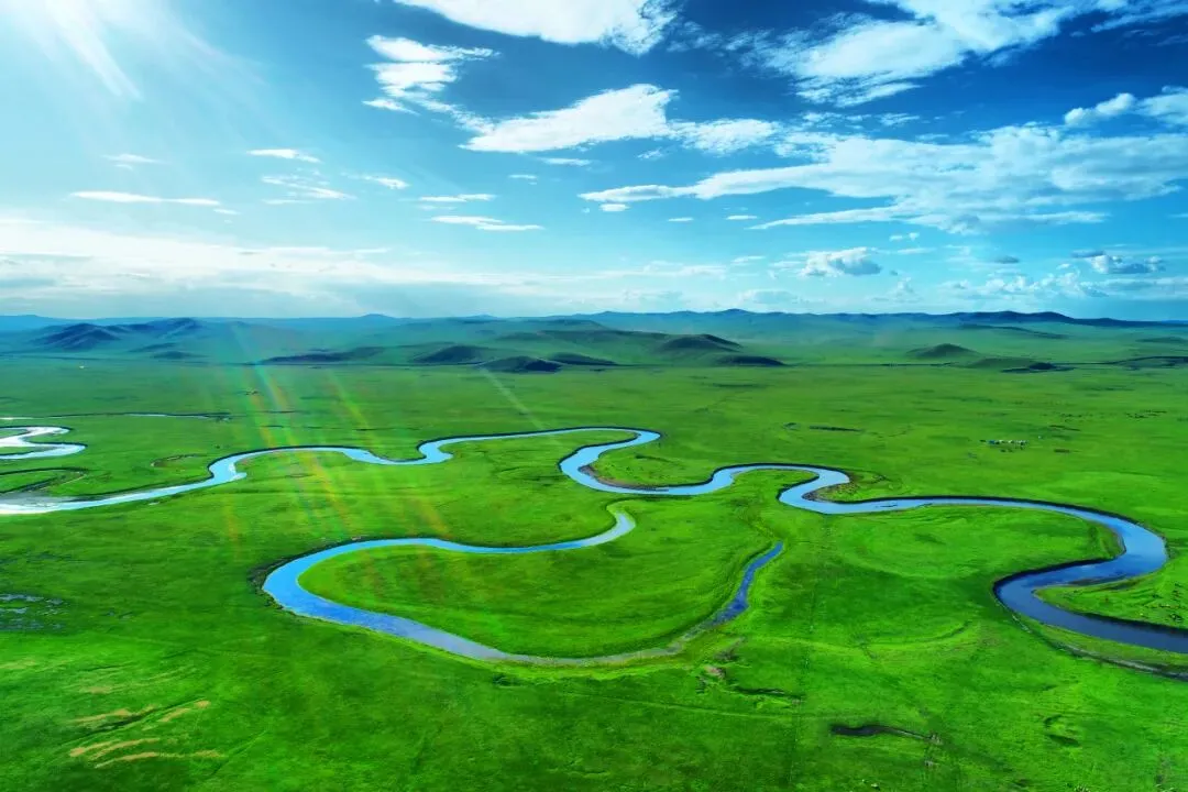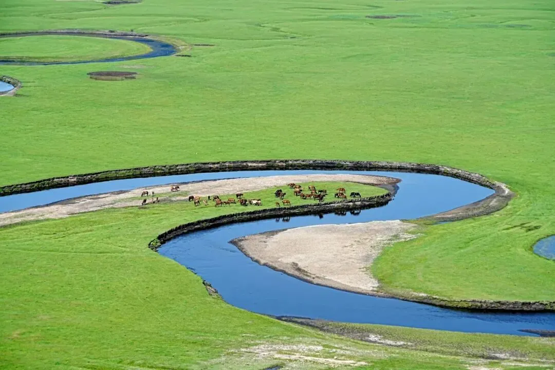 莫尔格勒河地处陈巴尔虎旗草原腹地,因河道极度蜿蜒,从空中俯瞰如同巨龙盘旋,被誉为“天下第一曲水”。