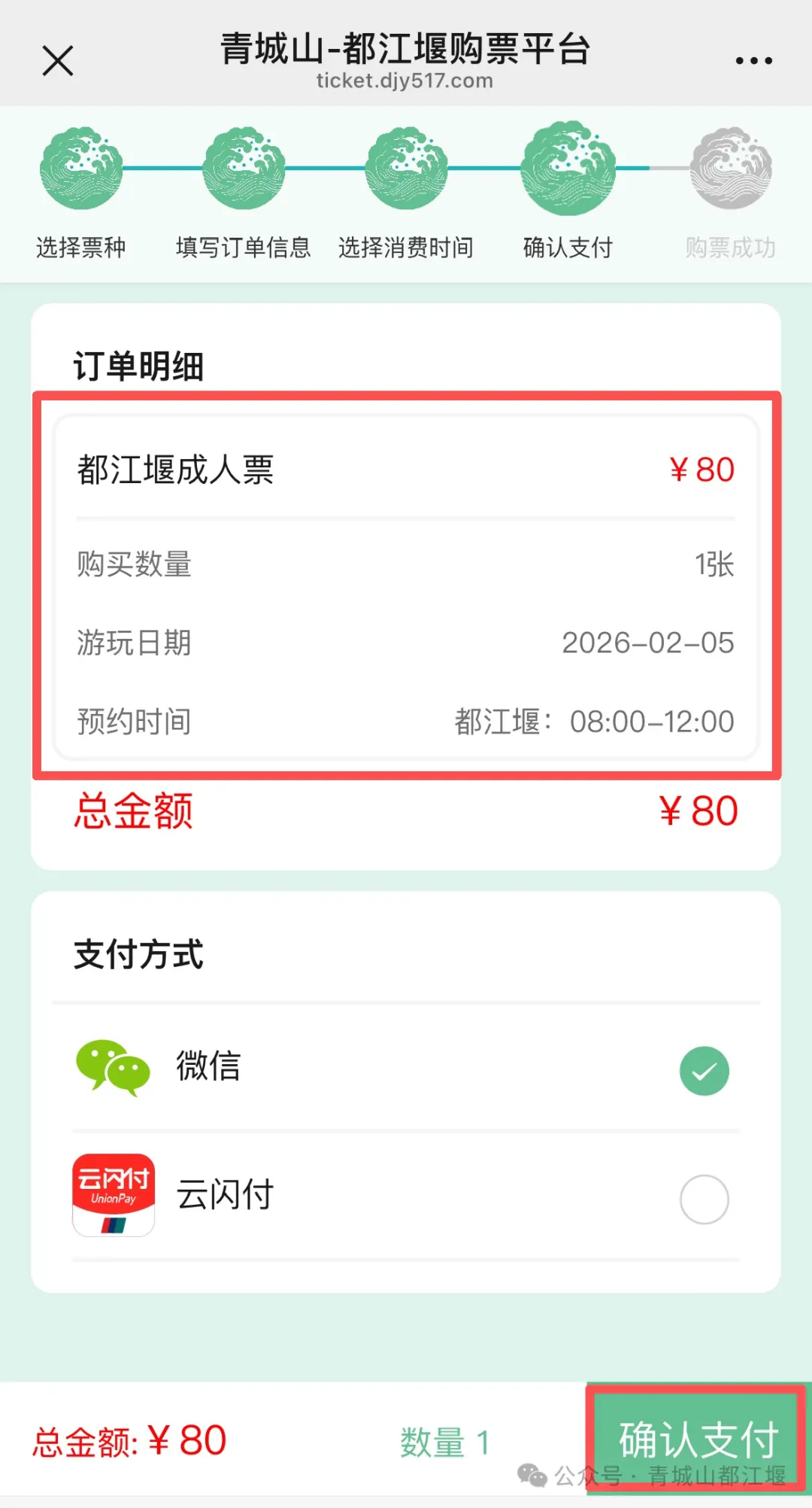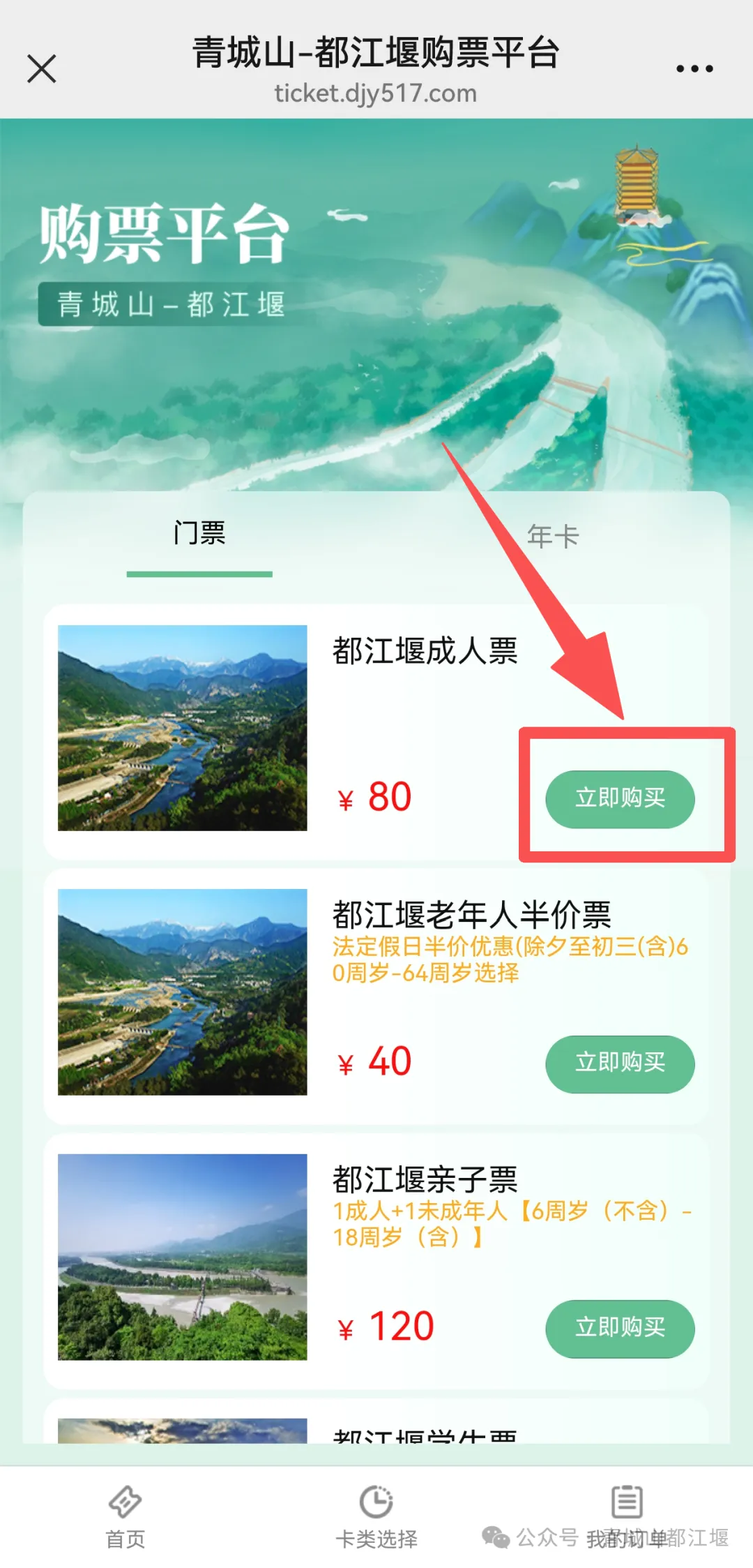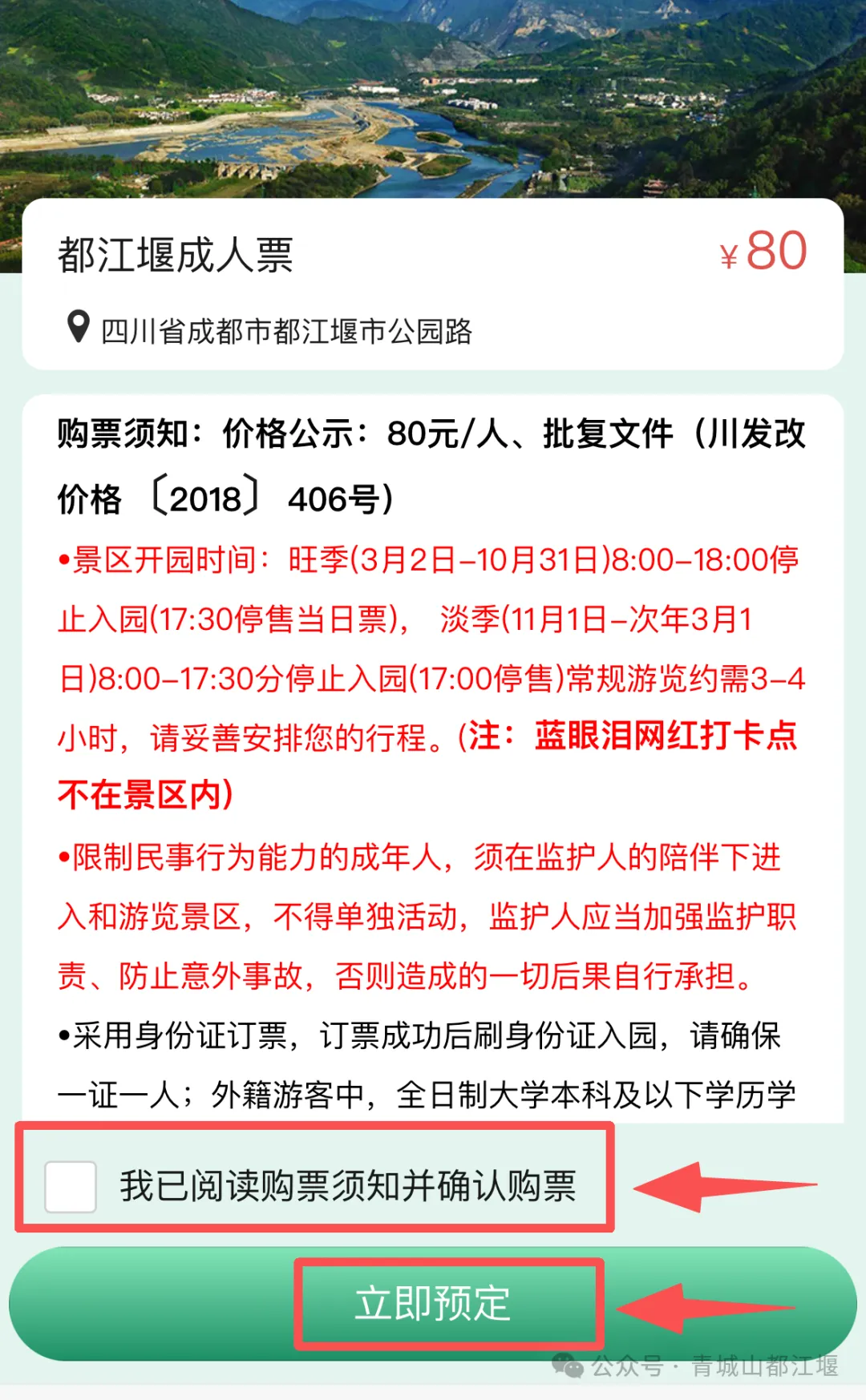 请通过景区官方微信公众号(青城山都江堰、悦游都江堰),或官方授权平台美团、携程等提前预约购票。若您通过非官方公布渠道购买门票,可能会出现无法入园、无法退票等情况,请您谨慎选择购票途径。