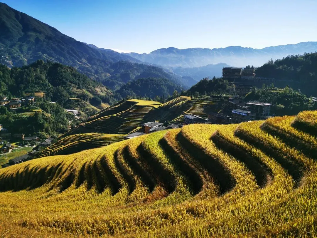 梯田叠在群山的褶皱里。山泉漫过田埂,注满层层水田,亮成一片碎银。晨光斜射,水面反射光线,晃成流动的金波。瑶家吊脚楼嵌在梯田间,青瓦在雾中泛着柔光。农人赤足踏过田埂,竹篓里装着新育的禾苗。泥土的腥气混着春水的清冽,漫遍山谷。远处竹林沙沙作响,新笋破土而出,顶着浅褐的笋衣。田埂边野花点点,紫白相间,缀在翠色的画布上。风过处,水面涟漪相逐,荡开一片接一片的光影。