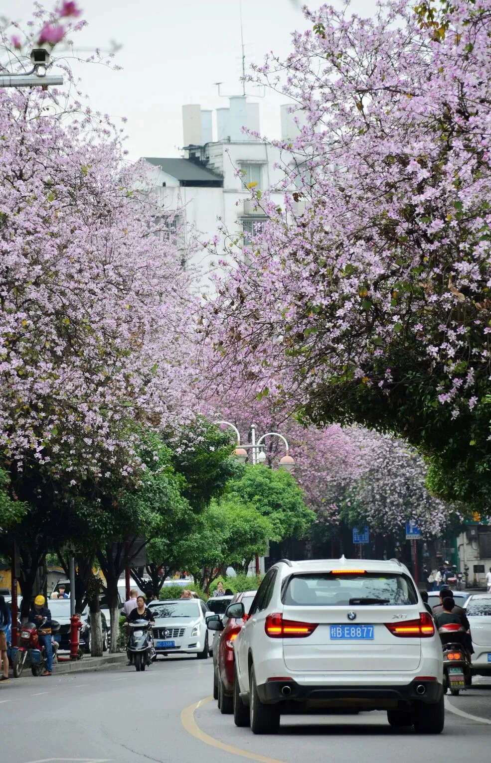 街巷间紫荆花缀满枝头。粉白与浅紫交织,堆成团团云霞。花瓣轻坠,铺在柏油路与青砖墙上,落成薄厚不均的花毯。枝头新叶初展,嫩绿衬着花色,鲜妍夺目。阳光穿过花影,在地面投下斑驳的图案。楼宇藏在花丛深处,窗棂映着花的倩影。路边石栏上落满花瓣,行人脚步轻缓,怕惊扰这份柔静。花气清甜,漫过街角的小吃摊,混着米粉的暖香。偶有花瓣落在肩头,转瞬滑落,留下一丝若有若无的轻痕。