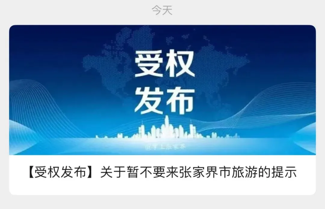 刚刚,掌上张家界微信公众号发布关于暂不要来张家界市旅游的提示。
