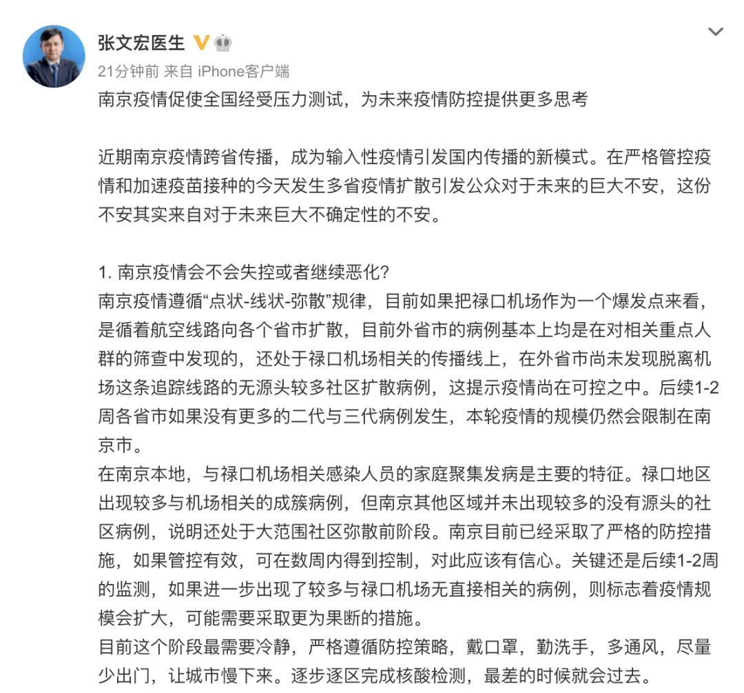 29日凌晨,张文宏发布微博称,在南京本地,与禄口机场相关感染人员的家庭聚集发病是主要的特征。禄口地区出现较多与机场相关的成簇病例,但南京其他区域并未出现较多的没有源头的社区病例,说明还处于大范围社区弥散前阶段。南京目前已经采取了严格的防控措施,如果管控有效,可在数周内得到控制,对此应该有信心。