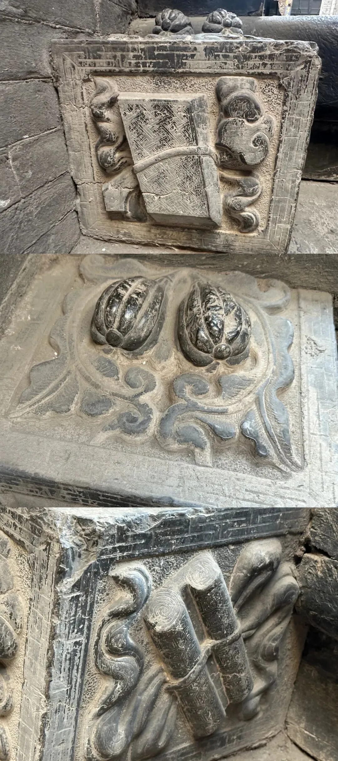 当你来到书房院门前,一定会被眼前的景象所吸引。门口的石墩上,雕刻着并蒂香瓜,那圆润的形状,仿佛在诉说着渠家的团圆与美满。两侧的石墩则雕有书卷、画轴,寓意深远,就像一本本打开的史书,彰显着渠家“书香门第”的显赫家世。