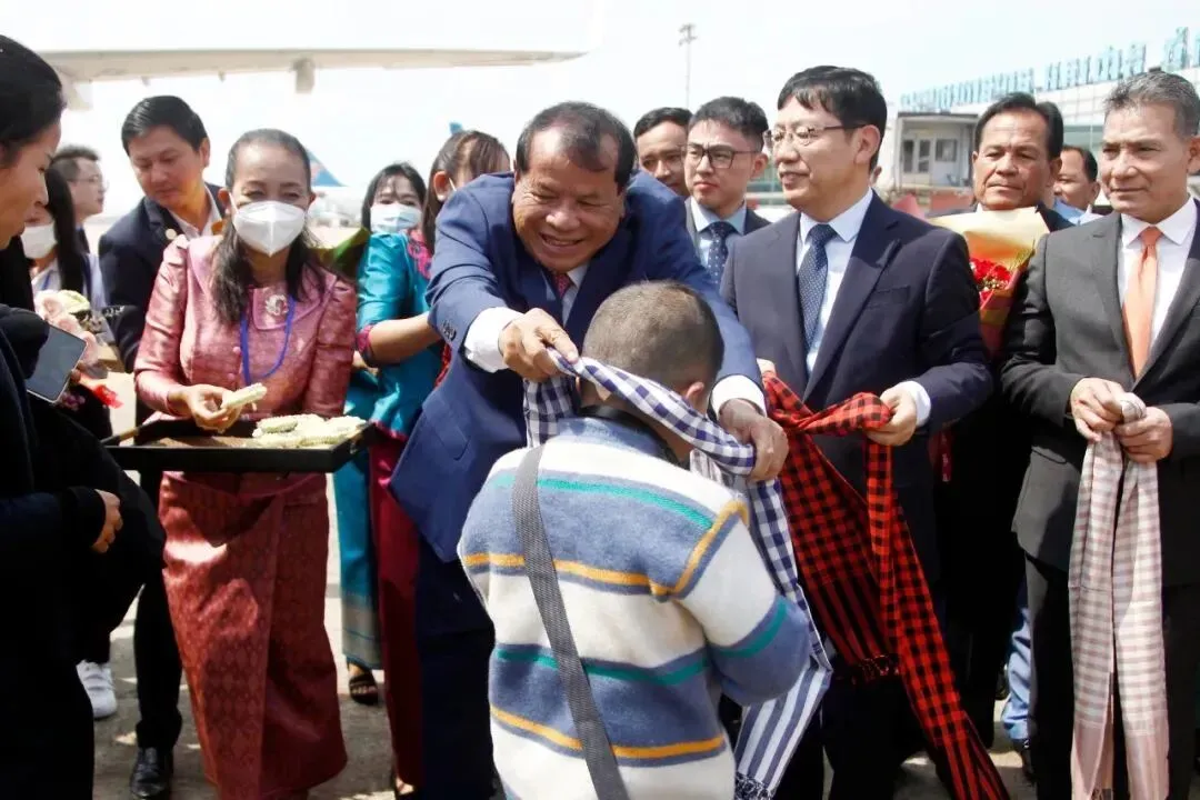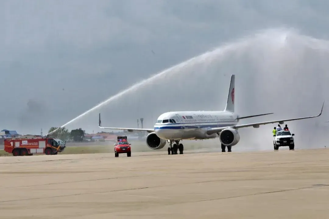 2月7日,国航航班在柬埔寨首都金边国际机场接受水门礼。新华社发(批隆 摄) 飞机停稳后,等待乘客们的是两排欢迎人群。伴随热情的柬埔寨传统舞蹈昌扬舞,柬埔寨旅游大臣童昆和中国驻柬埔寨大使王文天向中国客人逐一送上柬埔寨传统水布和花环,给予他们热烈欢迎和诚挚祝福。 童昆在欢迎仪式上说,中国恢复出境旅游对柬埔寨和世界经济都非常有利。今年,柬埔寨将争取吸引80万至100万中国游客。