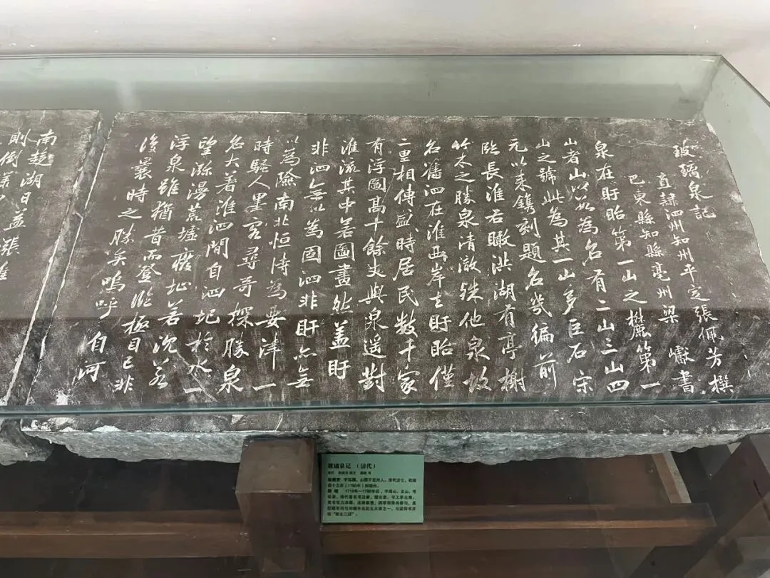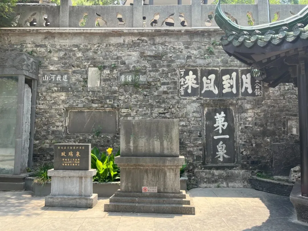 壁上的“玻璃泉”为冯守书,“第一泉”为葛廷章书,可堂所书的“月到风来”,则写出了玻璃泉之夜的怡然和诗情。当日寇蹂躏我大好河山,爱国义士邱国珍便赫然刻上“驱除倭虏,还我河山”表达了国人的民族气节。玻璃泉壁左侧的《泗州普照禅寺灵瑞塔》为元朝大书法家赵孟頫晚年的佳作,勒于延祜五年(1318年)。
