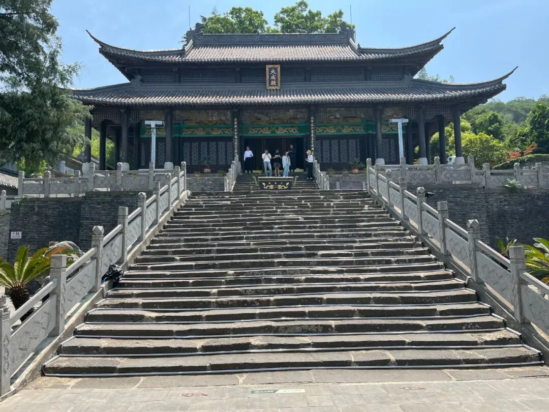 进入山门,眼前重重台阶,高处一座大殿,飞檐翘角、重檐巍峨,檐上竖立一匾,蓝底金字,分明是“大成殿”三字。