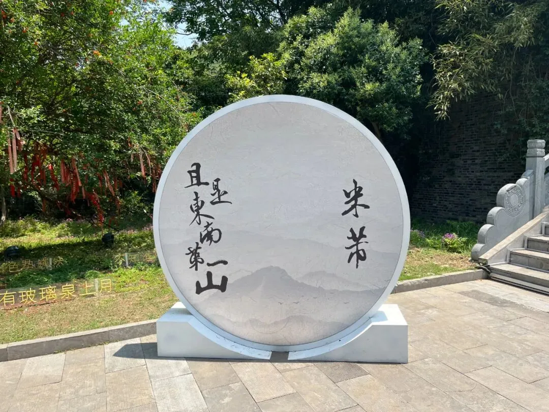 沿路桥边,立着一块圆形石牌,上写:“且是东南第一山——米芾”。