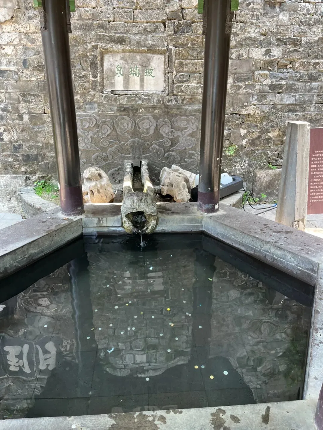 亭子内是一井清泉,泉水由龙头槽流出。池内丢了许多硬币,白花花的,清浅可见。