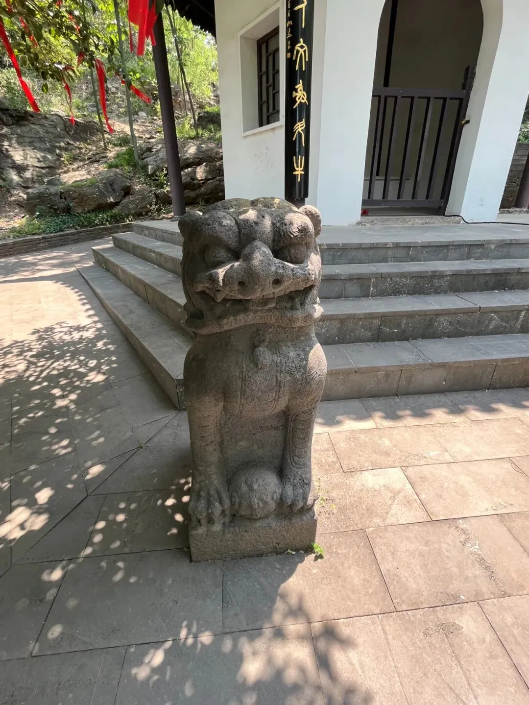 亭子周边散放着数尊石兽,如石狮。