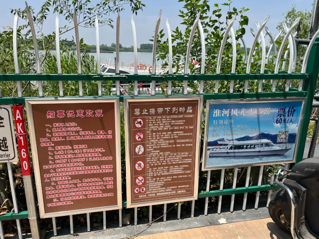 立着一排宣传栏,上面贴着“船票优惠政策”。上面写道:成年人票价60元,60岁以上老人持身份证享受船票半价。等等。