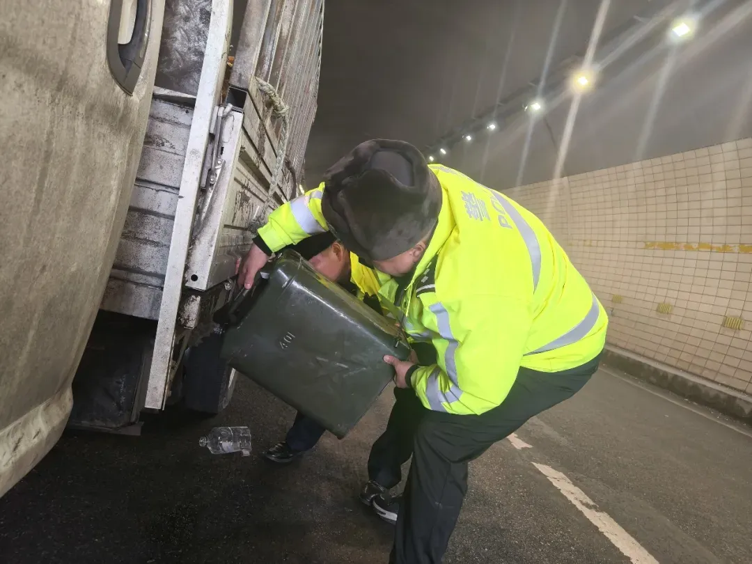 与此同时,霍城县公安局还接到一起紧急求助:驾驶人陈某因出行前未检查油量,行驶至隧道时燃油耗尽被迫停驶。由于隧道内视线较差、车流不断,存在安全隐患。执勤民辅警立刻携带应急油料赶赴现场,做好安全警示防护后快速为车辆加注燃油,并检查车辆确保无其他隐患。车主对民警的及时帮助连声道谢。