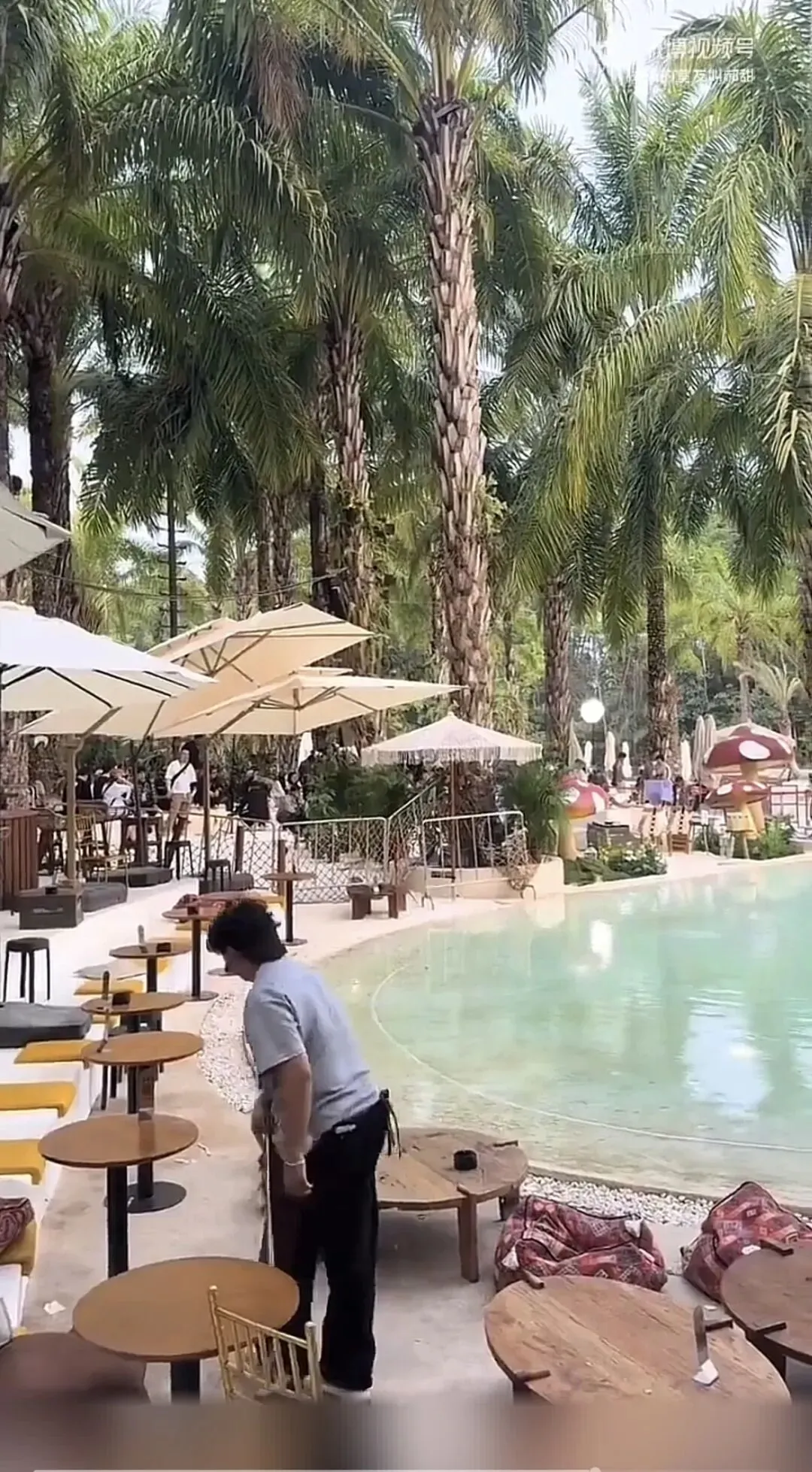 从网友发布视频来看,此景是一个碧绿水池,四周有高大的个棕榈树,一些带版纳热带风情装饰,周围都有游客围坐聊天,是一个休闲娱乐地方。