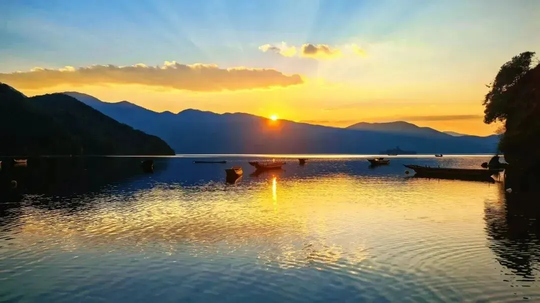 女神湾是泸沽湖最美、最安静的地方,正对格姆女神山,是看日落的绝佳位置。傍晚时分,夕阳把女神山染成金色,倒映在湖中,美到令人失语。