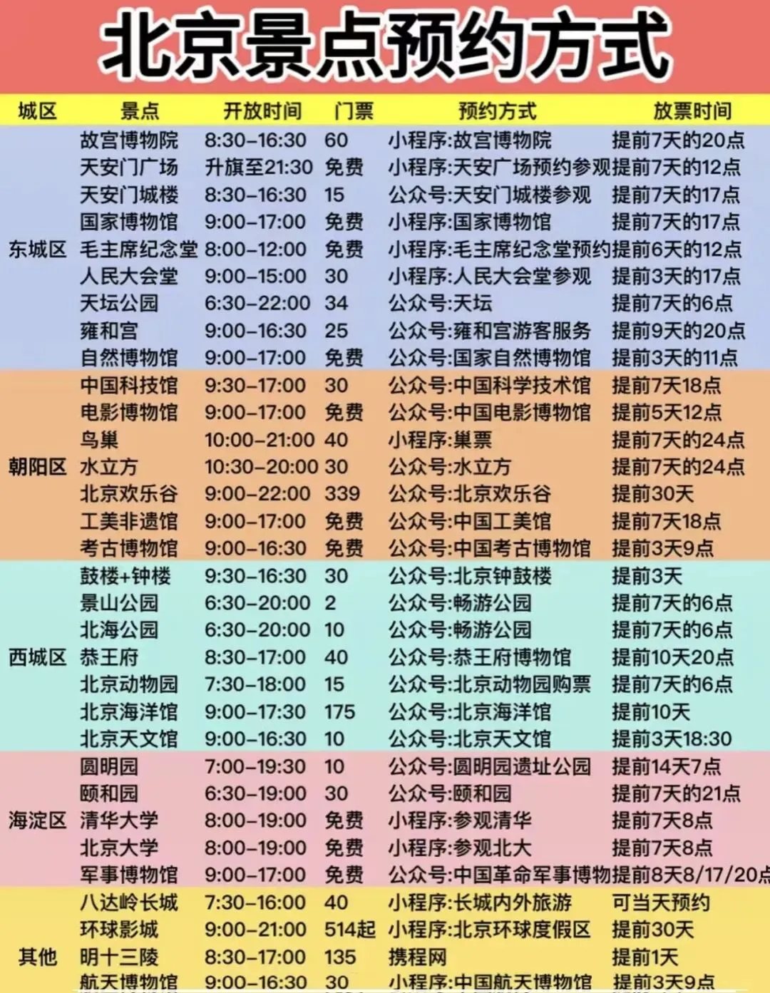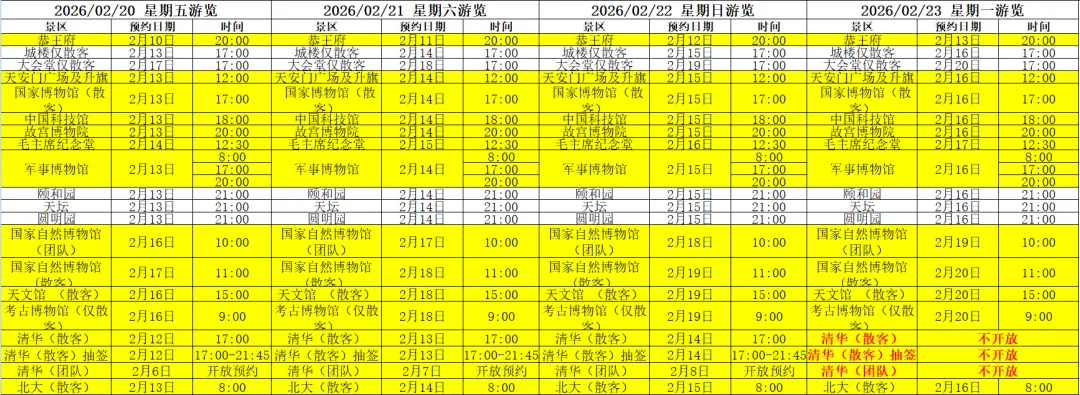 毛主席纪念堂:提前6天12:30国家博物馆:散客提前7天17:00故宫博物院:提前7天20:00天坛:提前7天21:00颐和园:提前7天21:00恭王府:提前10天20:00圆明园:提前7天0:00中国科技馆:提前7天18:00自然博物馆:团队提前4天10:00。 散客提前3天11:00北京天文馆:散客提前3天18:30升降旗天安门广场:提前7天12:00天安门城楼:提前7天17:00