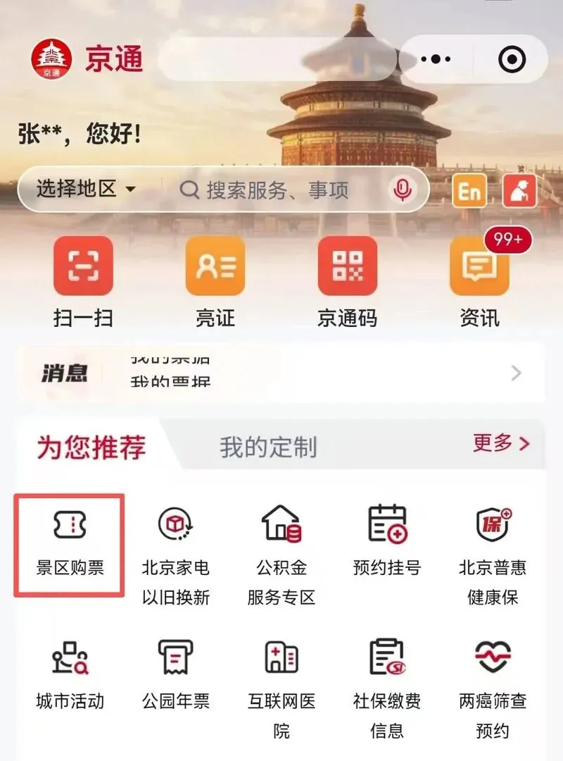 游客可在“京通”微信小程序首页推荐栏点击“景区购票”到达平台购票页面。