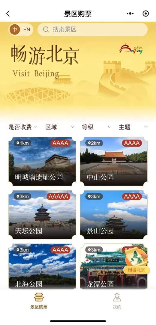 北京市景区统一购票服务平台正式入驻“京通”微信小程序,目前包括天坛公园、颐和园、八达岭长城、景山公园、北海公园、北京动物园等74家个5A及4A级景区官方购票渠道。