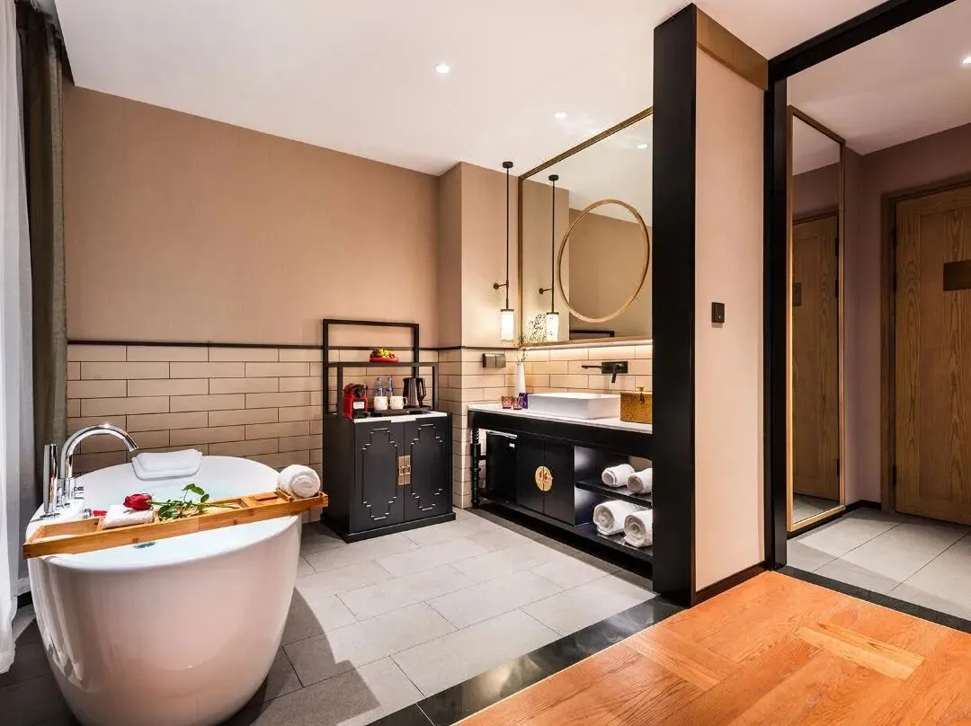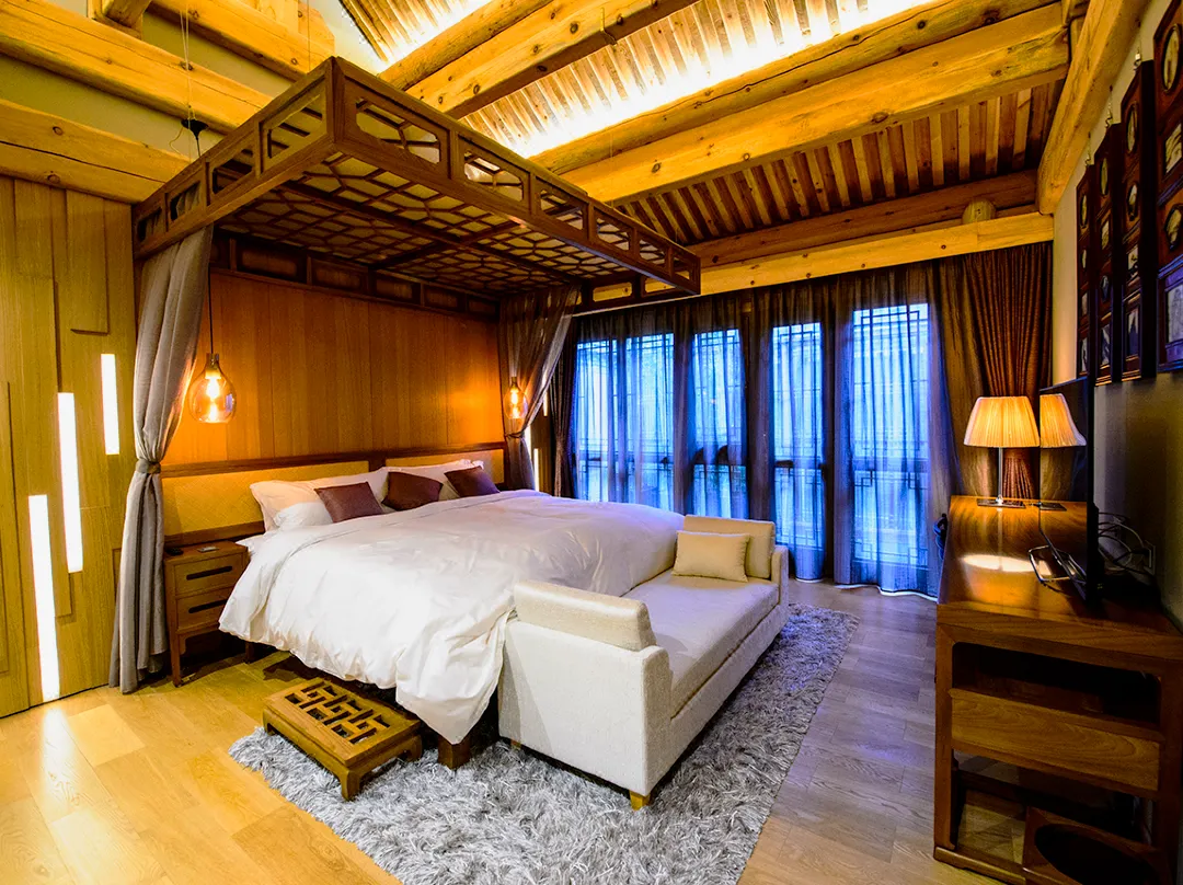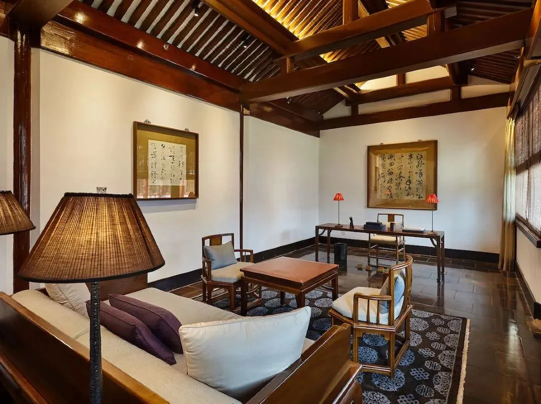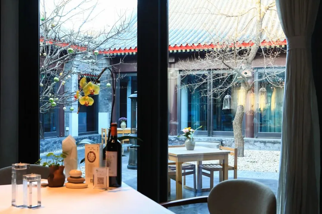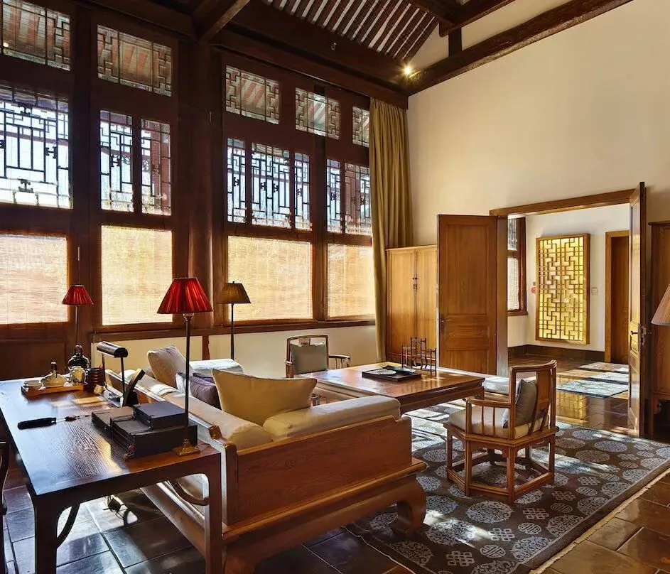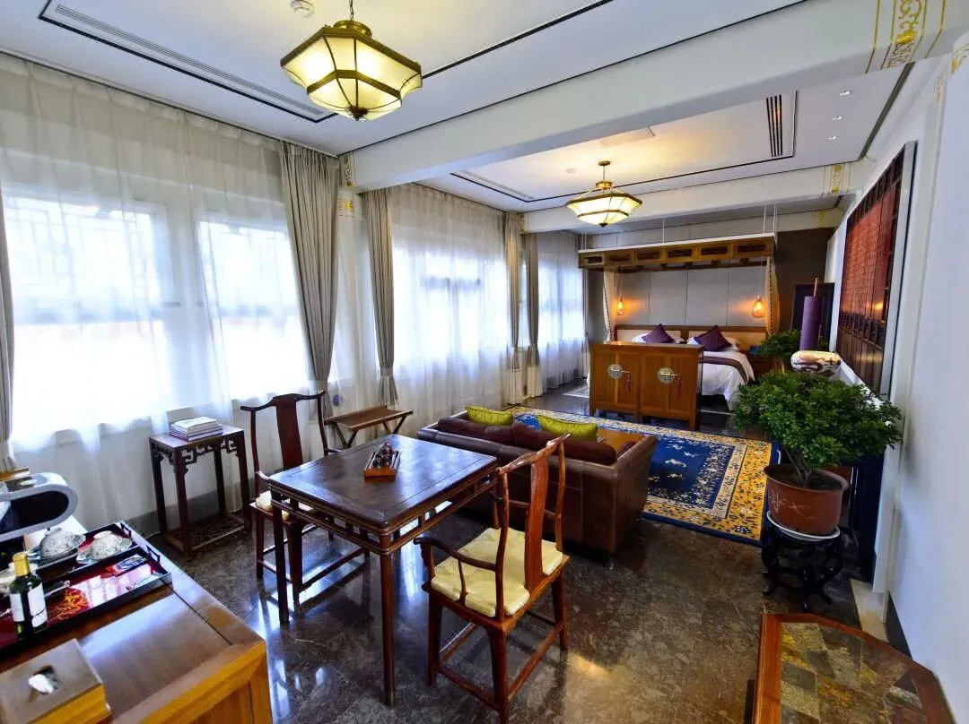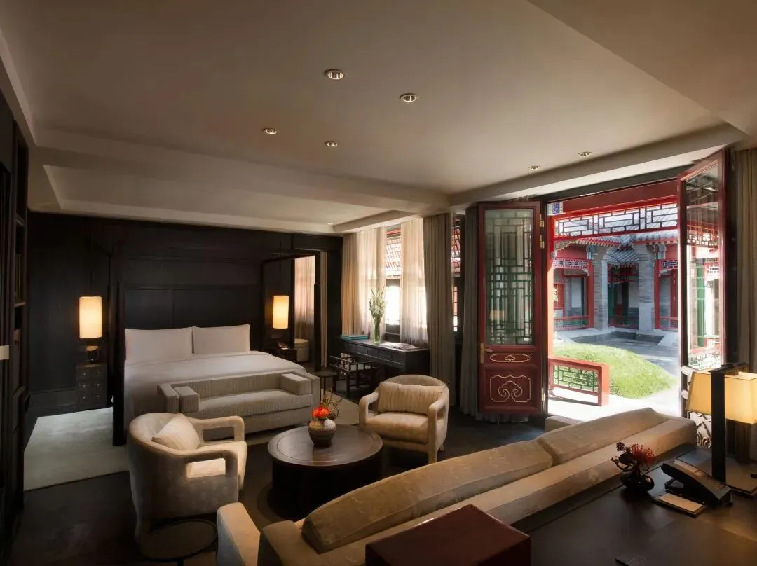 推开玻璃门,轻叩朱红色的大木门,随之而来的浑厚声音让人在刹那间恍惚,不知沉重木门的背后有着怎样的故事。进入大堂休息区一下子便被这玻璃顶所吸引,经服务人员介绍得知,原来酒店业主很喜欢大英博物馆的玻璃屋顶,遂想着在这古朴的四合院顶部如法炮制一番。既可抵御京城的雾霾天气,又不妨碍观赏晴空时的美丽天色。整个酒店采用美国布朗新风系统和前端净水装置,确保每位客人从进入酒店的那一刻起,便远离大气 及水污染。穿过大厅走进后院,映入眼帘的是一个标准大四合院。院子被东西南北4间特色各异的客房包围,东西房为酒店基础房型,房内古代闺房专用的玫瑰椅和传统欧式扶手椅的混搭组合毫不突兀,金丝楠木大块整料打造的落地花罩古韵十足却不会让人觉得憋闷,特意到江南编制的藤芯床架舒适透气,使地暖的热气 自然传达到温暖的床上。床垫更是采用英国皇室专用百年手工定制品牌HYPNOS,处处彰显着内敛的尊贵气 质。房内更为尊贵的客人准备了不同功效的香炉熏香,安神助眠或是提神醒脑都随心所欲。南北房均是 超过100平米的大客房,北房里一张明式花梨榻仿佛瞬间就可以把人带回历史中去。南北房里各一套的明 式圆包圆海黄桌椅均价值百万以上,更有年代久远的大漆器架几案,清朝嘉庆时期的寿匾等。使古董不 再是只可远观不可亵玩之物。古典优雅与现代科技恰如其分的结合,让人既可以坐在价值百万的古董木 桌前提笔作画,在铺着软垫的中式卧榻里静静读书,也可以打开自动升降的背投电视收看节目,之后躺 在硕大的露天按摩浴缸里,打开自动天窗看花看雪,真是再惬意不过了