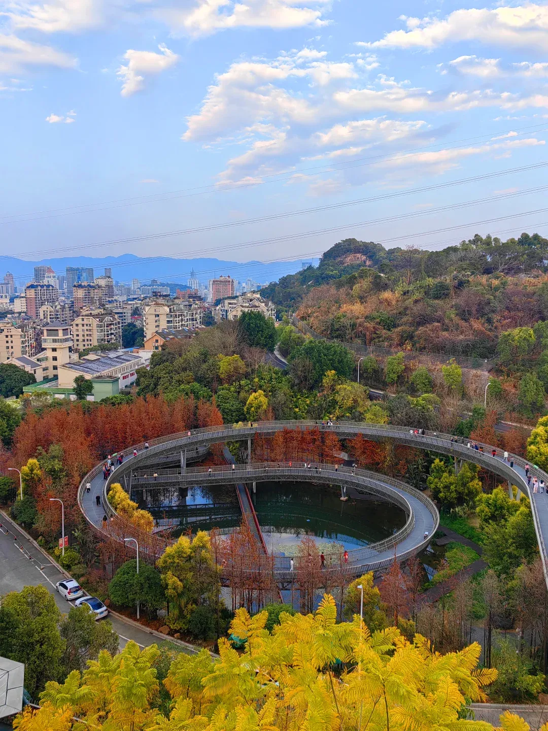免费入园。全长19公里的空中栈道,镂空格栅步道穿行于森林之上,3号口、5号口是热门段;傍晚亮灯后如星河入林,可徒步、骑行(部分路段禁车)、吸氧,俯瞰城市与山林。建议游玩2小时,傍晚更佳。