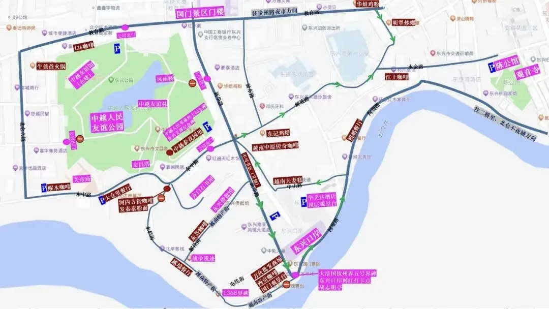 醒木咖啡—关帝庙—大仓里—文昌塔—白石芭蕉书屋—中越人民友谊公园—东兴国门景区门楼—不可书店—侨批馆—东荟咖啡—战争遗迹—越境餐厅—1368界碑—国门观景台—西贡咖啡—万众国际批发商场—大清国钦州界五号界碑—东兴口岸网红打卡点—华美达龙腾阁顶层观光—禧越餐厅—陈公馆(陈济棠纪念馆)—贵州路夜市—北仑不夜城—二桥里·浪淘沙