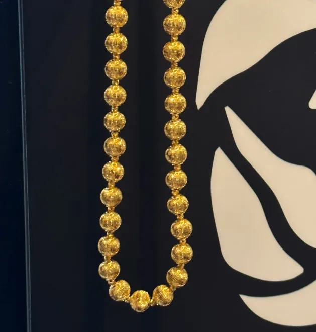 打开盒子的那一刻我心里就咯噔了一下,一条特别粗的项链躺在里面,目测得有二十多克的样子,链子是那种很夸张的水波纹款,,整体金灿灿的确实很耀眼,但是怎么说呢那个颜色就是黄得有点过分了,不是咱们平时在正规金店看到的那种带点温润感的金色