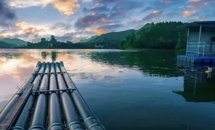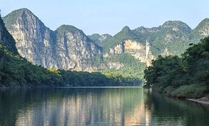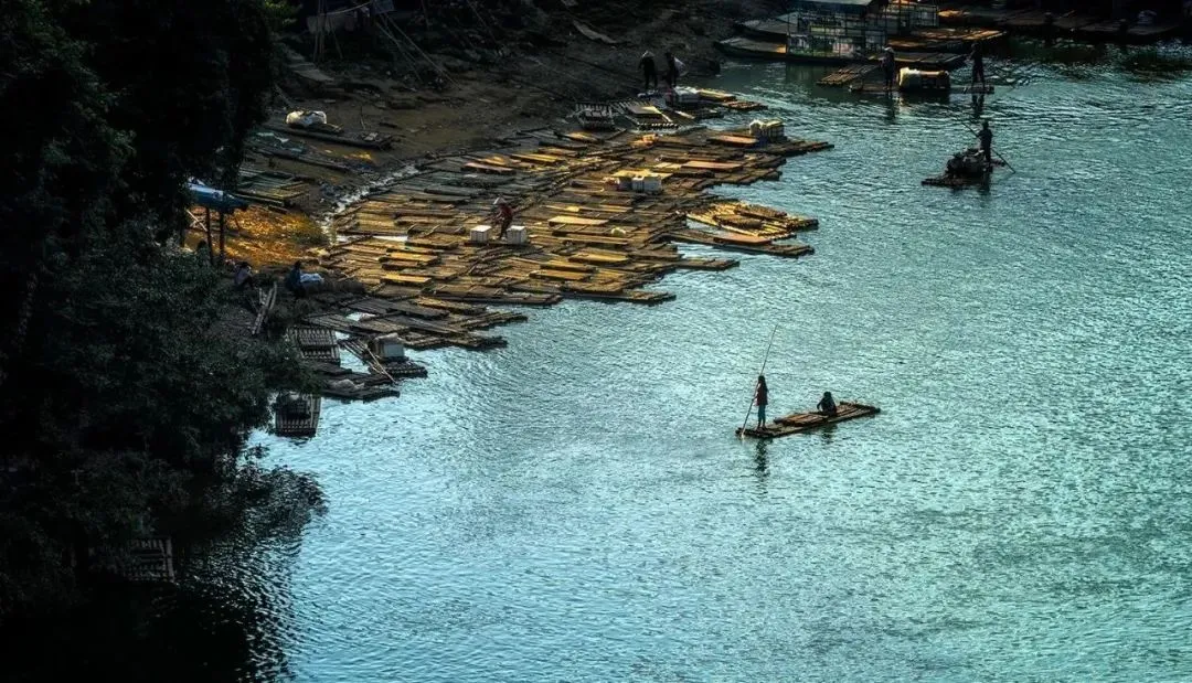 随时可见清澈的河水平缓地在船下流动,倒影着青山绿树、蓝天白云,构成一幅天然的山水画。