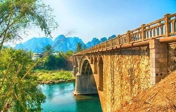 左江江畔美景非常,青山碧水,一架虹桥架于西边,通联了过去与未来。