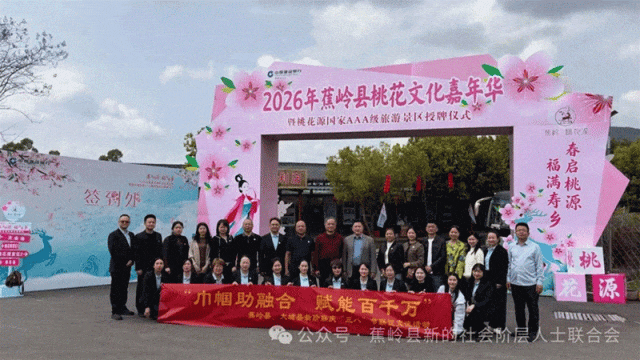 当天,蕉岭县新阶联会员代表联合大埔县新阶联会员代表一行20余人齐聚世界寿乡一一蕉岭,共赴春日之约、共话发展新篇。上午10时许来到蕉岭县新阶联监事企业钟明雄先生的广福桃花源,共同参与“春启桃源·福满寿乡”2026年蕉岭县桃花文化嘉年华暨桃花源国家AAA级旅游景区授牌仪式,感受以花为媒、以节促旅、以旅兴产,推动农文旅深度融合的生动实践。